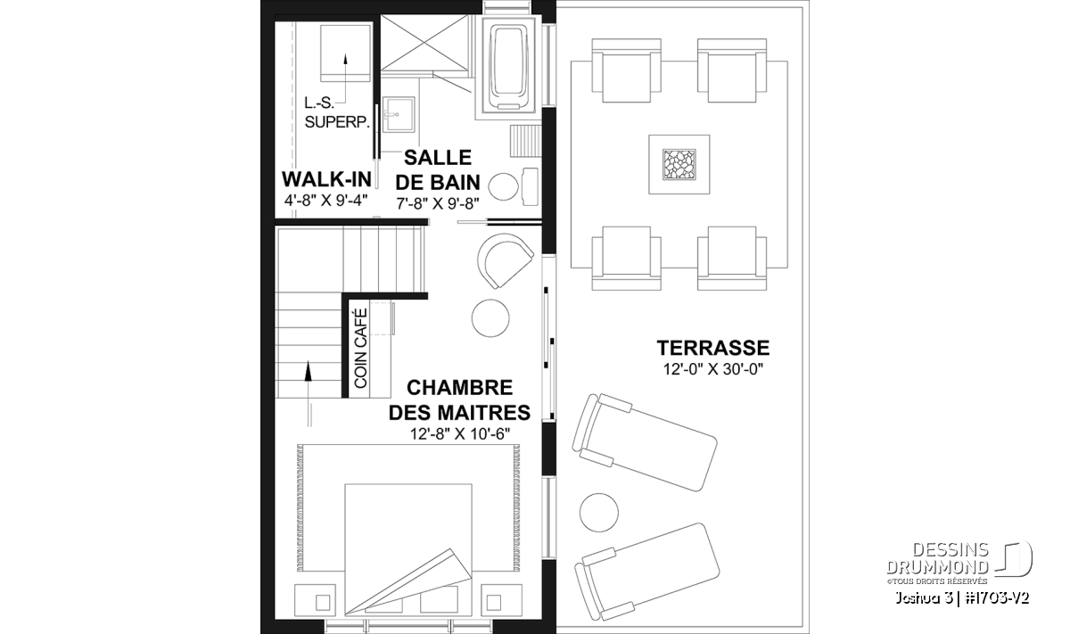 Le plan de maison Joshua 3 (1703-V2) propose une surface habitable de 1200pi2. La hauteur de tous les plafonds est de 8pi. La fondation prévue est une dalle flottante, bien que d'autres options de fondation sont disponibles.