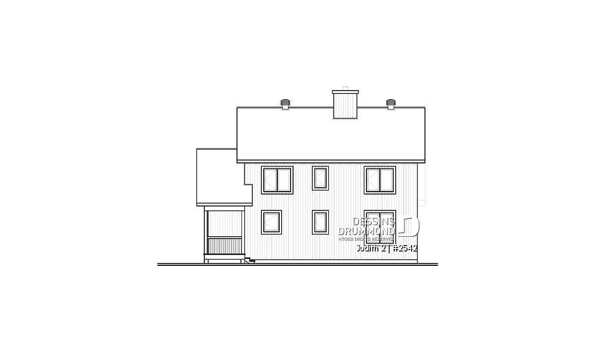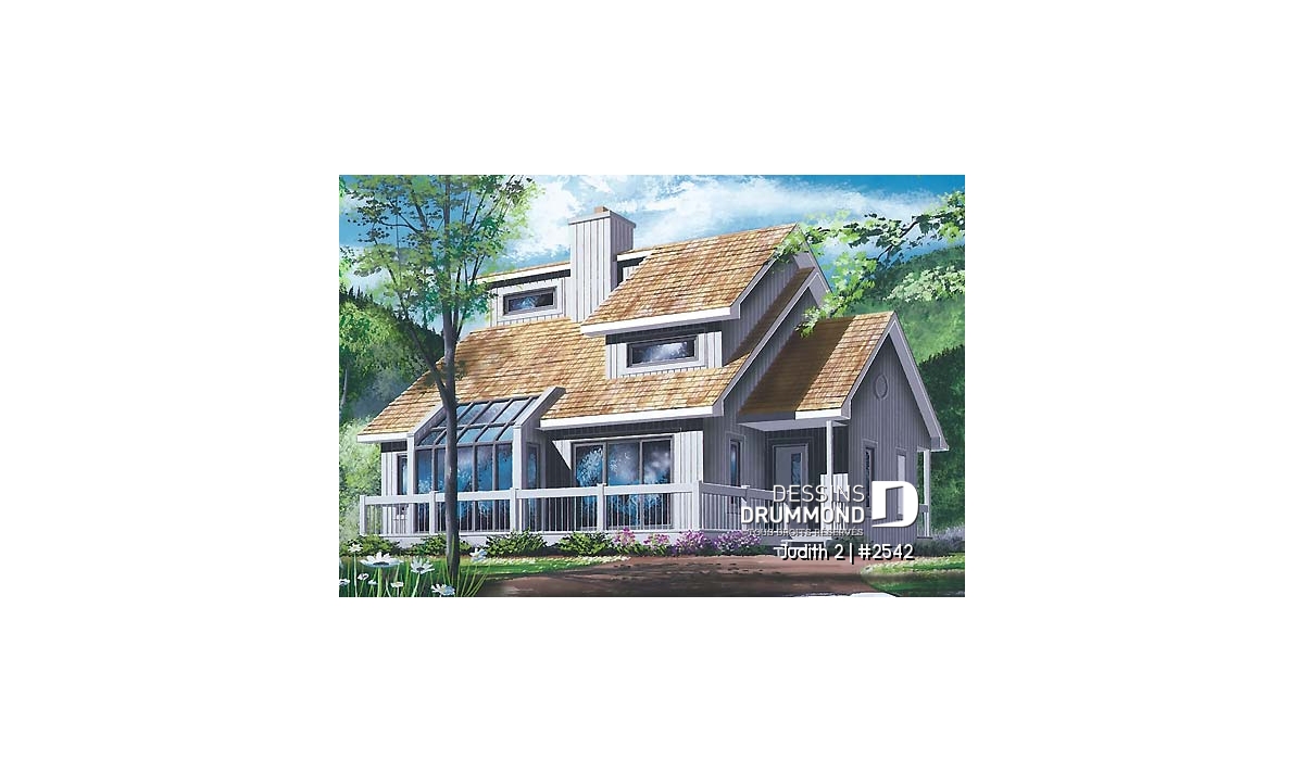Vue avant - MODÈLE DE BASE - Plan de maison avec beaucoup de lumière naturelle, 3 chambres, plafond cathédrale, chambre maître au r-d-c - Judith 2