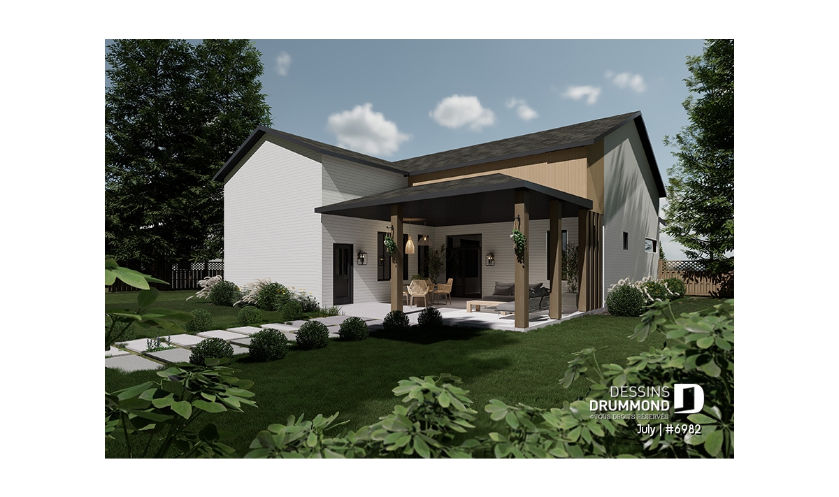 Le modèle JULY (#6982) propose également une option d’aménagement offrant une toute autre configuration. Dans cette version, le coin salle à manger et le petit salon du plancher de base sont transformés en une grande salle à manger pouvant accueillir jusqu’à huit personnes. Le garage pour VR devient alors un garage simple à l’avant, tandis que la portion arrière est réaménagée en deux chambres et une salle de séjour. Ces nouveaux espaces bénéficient d’un plafond spectaculaire de 16 pi 6 po, alors que le reste de la maison conserve ses plafonds de 10 pieds. La grande terrasse arrière couverte demeure inchangée.