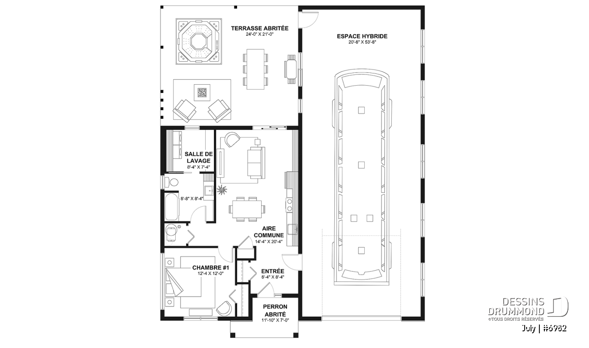 Le modèle JULY (#6982) est une petite maison confortable qui se démarque par une conception intelligente, chaleureuse et hautement polyvalente. Pensée pour s’adapter à différents styles de vie, elle offre une grande flexibilité d’aménagement, tant pour les besoins actuels que futurs. Son élément signature est sans contredit son impressionnant garage pour VR, d’une profondeur de 53 pi 8 po et d’une largeur de 20 pi 8 po. Avec une hauteur libre de 16 pi 6 po, ce garage peut accueillir aisément un motorisé de classe A, B ou C.