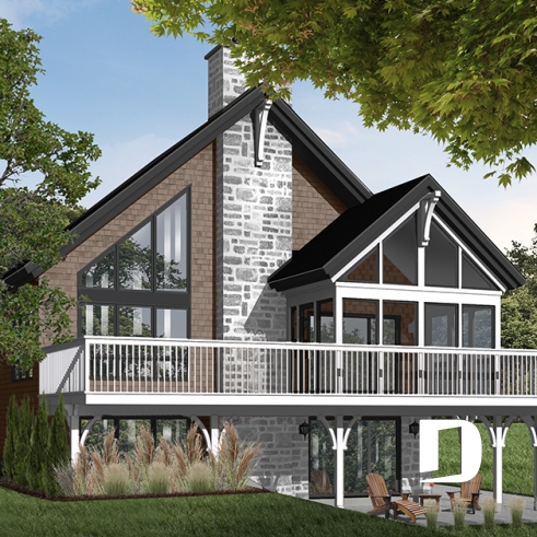Plan de chalet rustique, abri moustiquaire, 3 à 4 chambres, mezzanine, grande terrasse