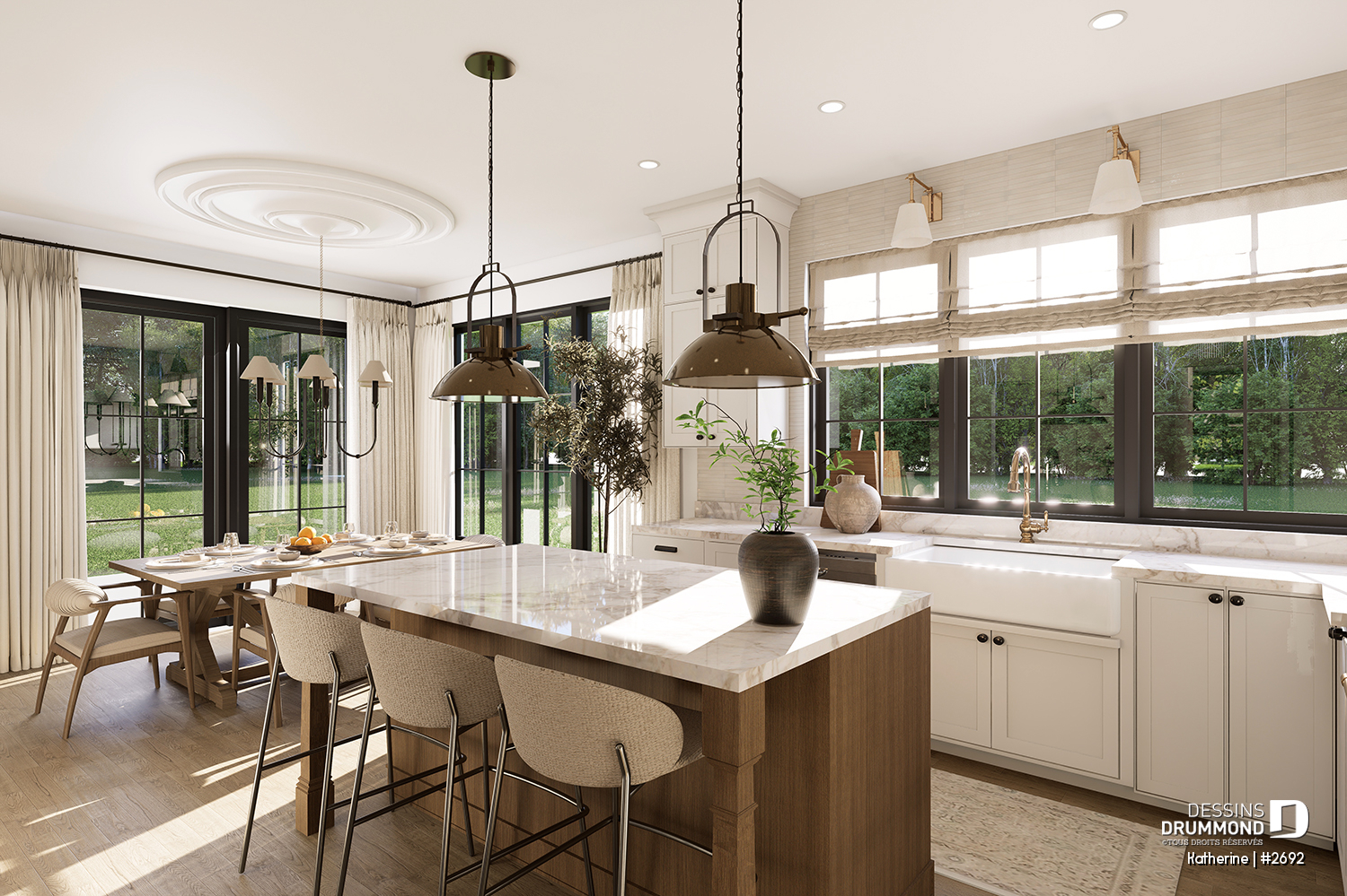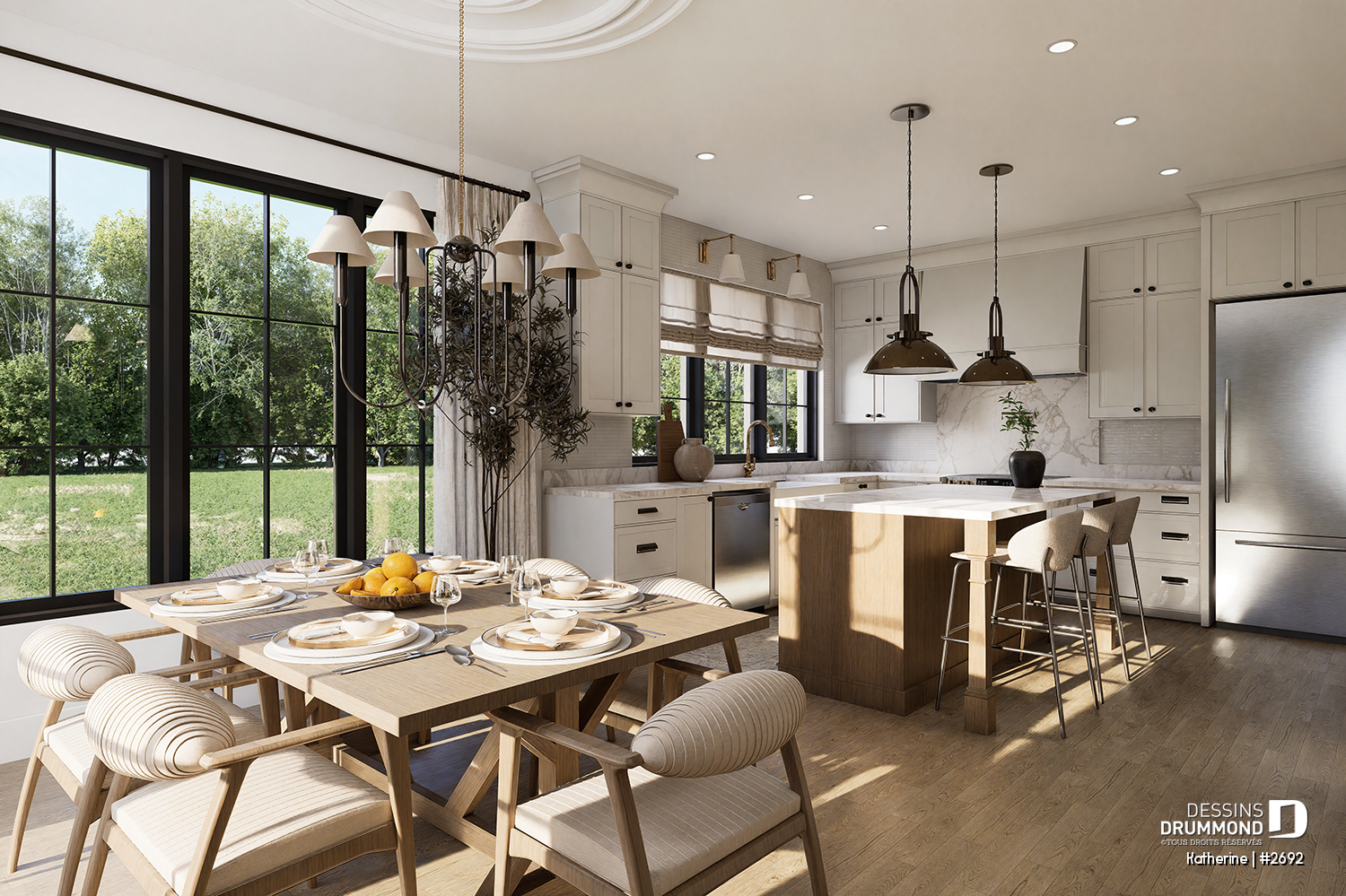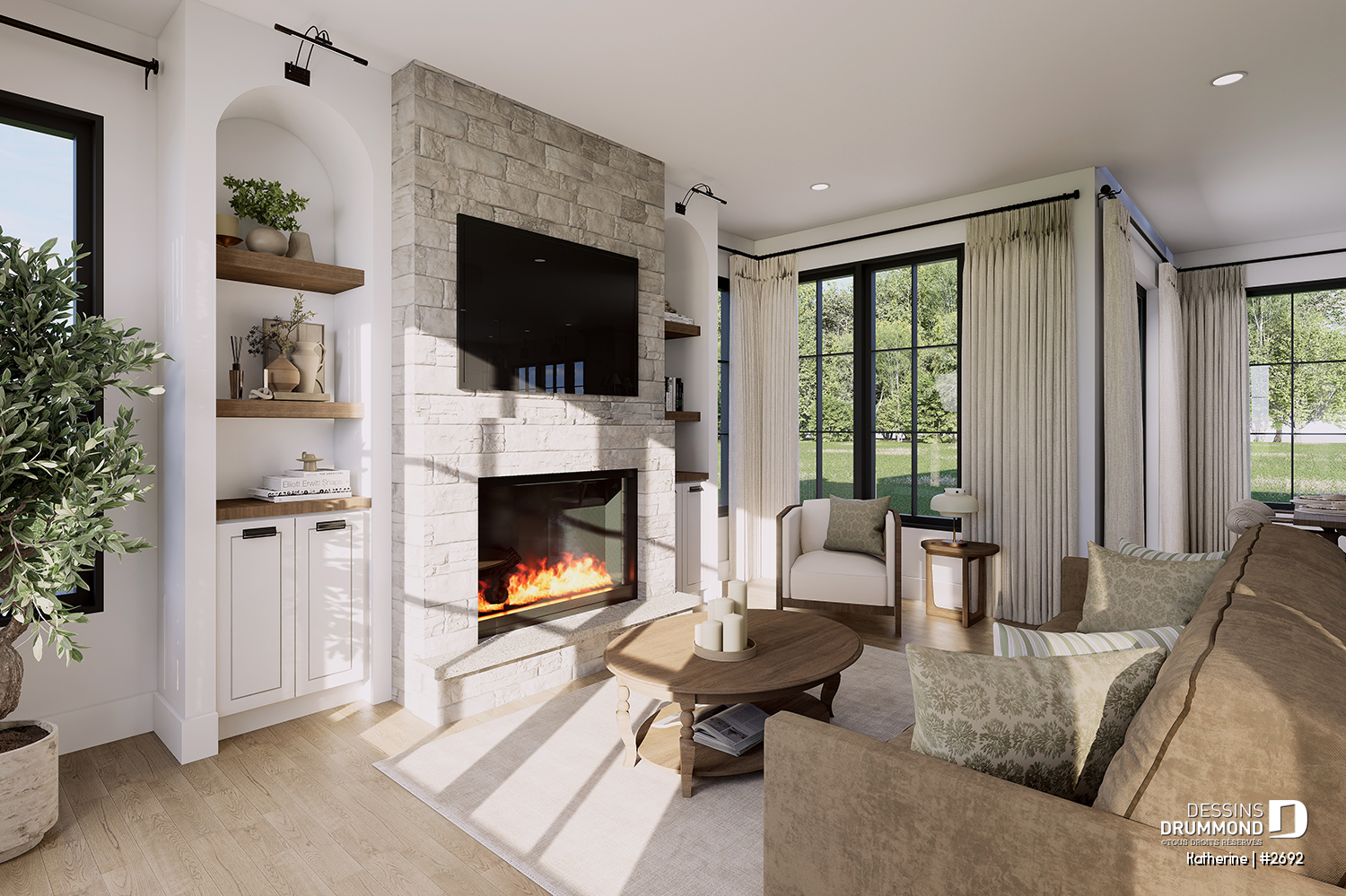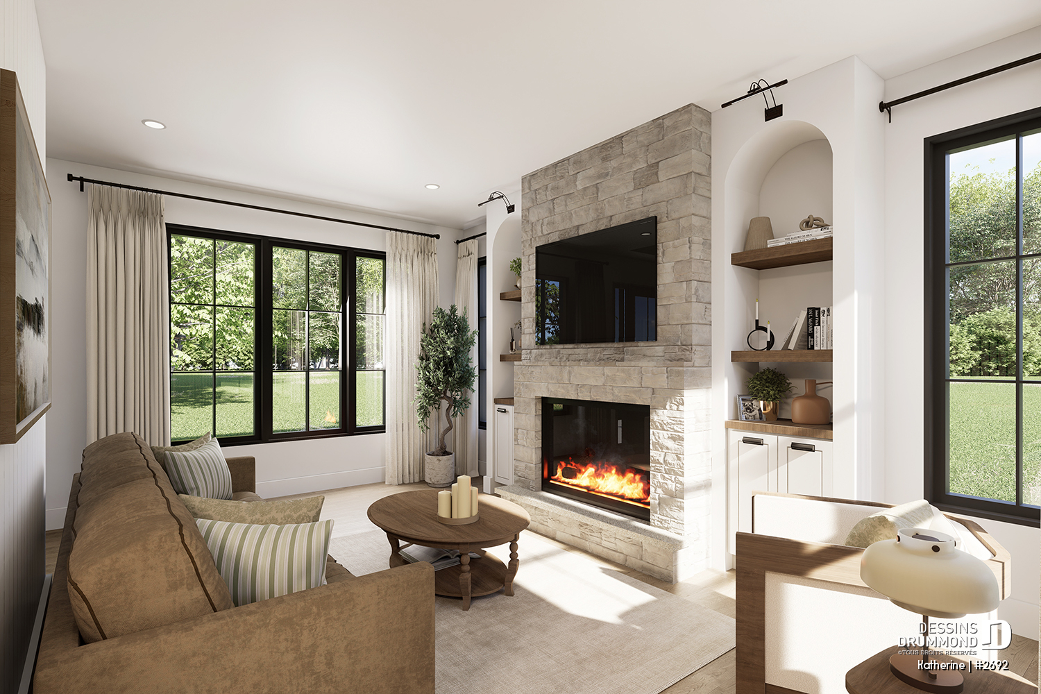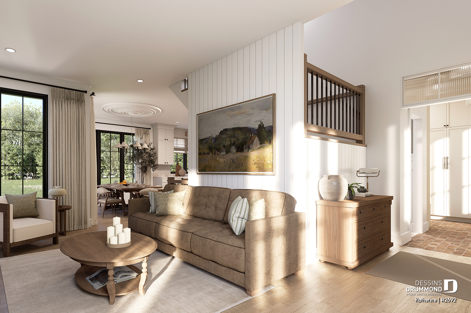 Cependant, si des poutres ou moulures de bois ou imitation de bois sont installées dans un plafond cathédral (sur nos illustrations ou photos), elles ne sont pas incluses dans les estimations. À noter que les poutres de bois illustrées sur l'extérieure de nos maisons sont incluses dans le coût, mais elles sont «capées » et non en bois massif.