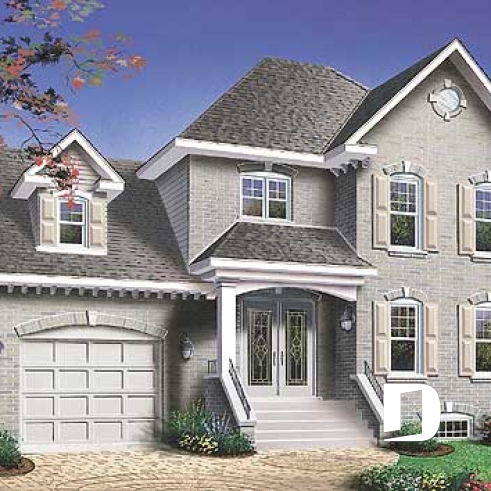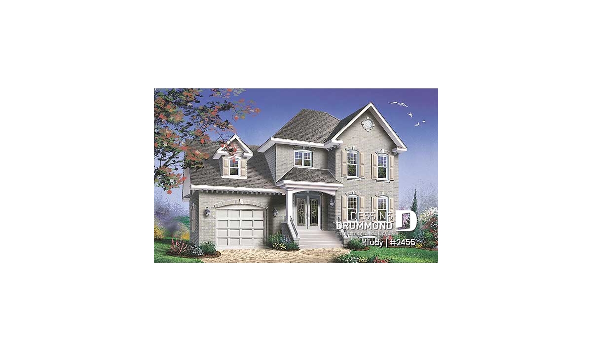 Vue avant - MODÈLE DE BASE - Maison style européenne, espace boni au-dessus du garage, 3 chambres, vestibule, grande salle bain - Kiludy