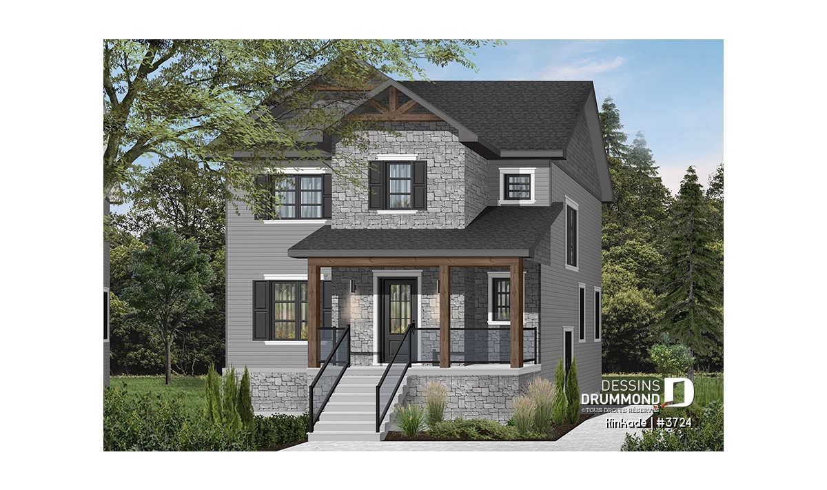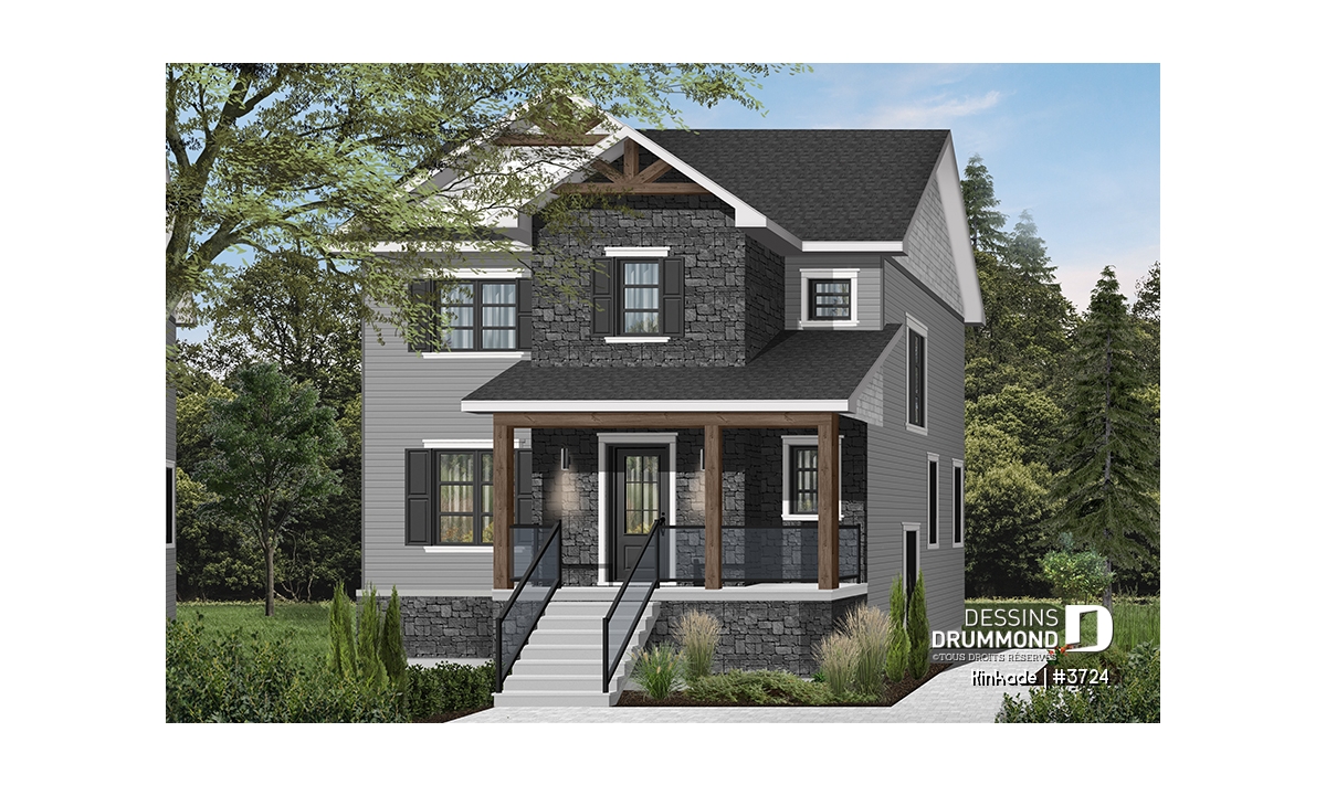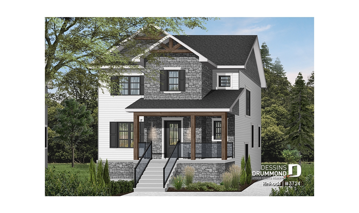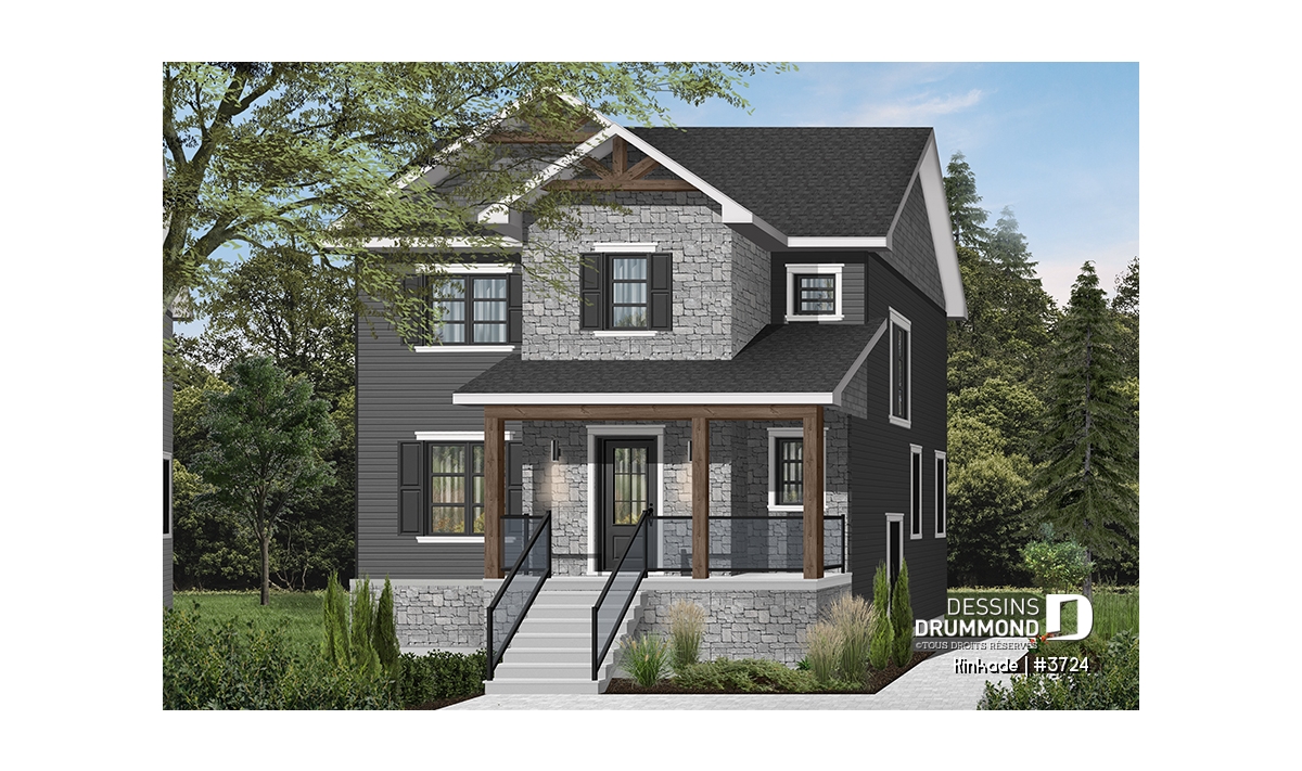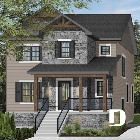 Cette maison de style transitionnel (mot à la mode pour exprimer qu'elle emprunte des traits aux styles traditionnel et rustique à la fois) fera l'affaire des familles possédant un terrain étroit! Effectivement, avec son 28' de largeur, il vous sera possible de la construire si votre terrain est de petite taille. De plus des accents de bois dans les corniches et sur la balcon avant amène une touche rustique à cette maison de style traditionnel avec volets.