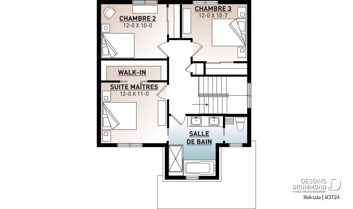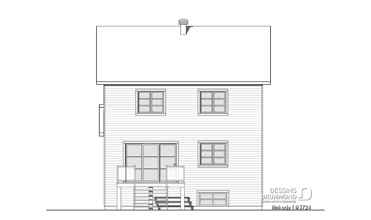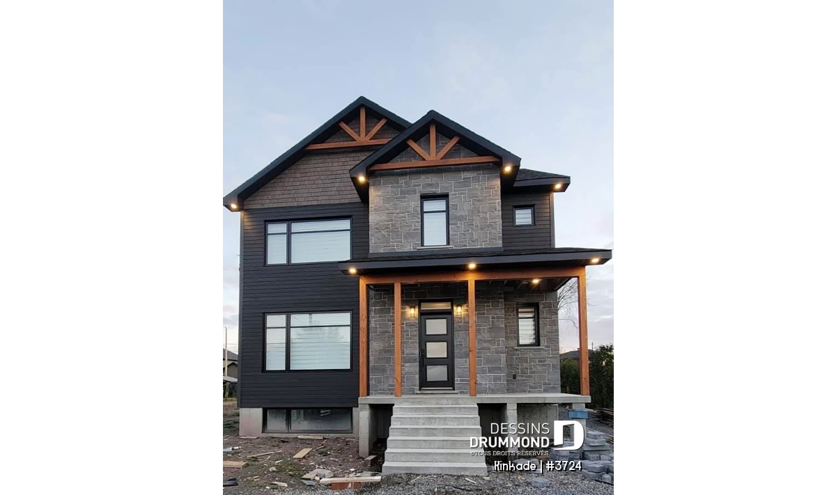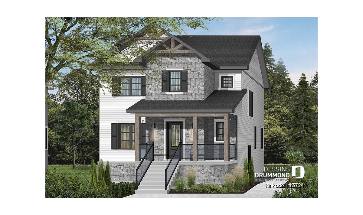 Cette maison de style transitionnel (mot à la mode pour exprimer qu'elle emprunte des traits aux styles traditionnel et rustique à la fois) fera l'affaire des familles possédant un terrain étroit! Effectivement, avec son 28' de largeur, il vous sera possible de la construire si votre terrain est de petite taille. De plus des accents de bois dans les corniches et sur la balcon avant amène une touche rustique à cette maison de style traditionnel avec volets.