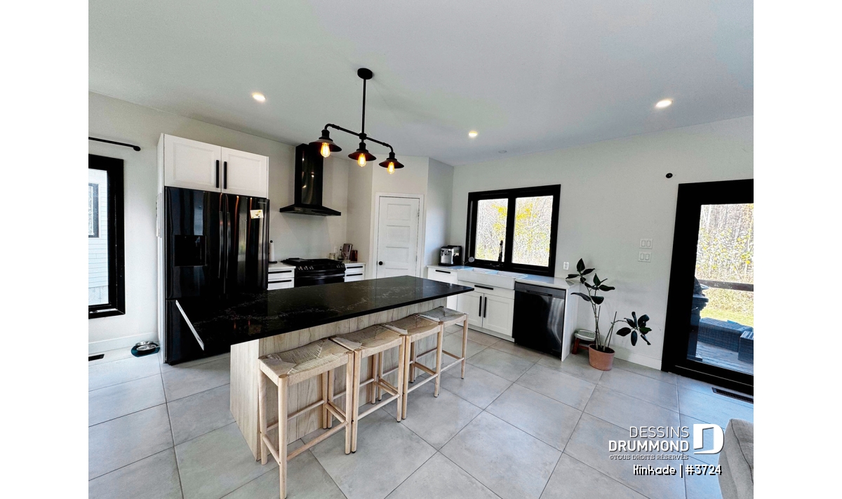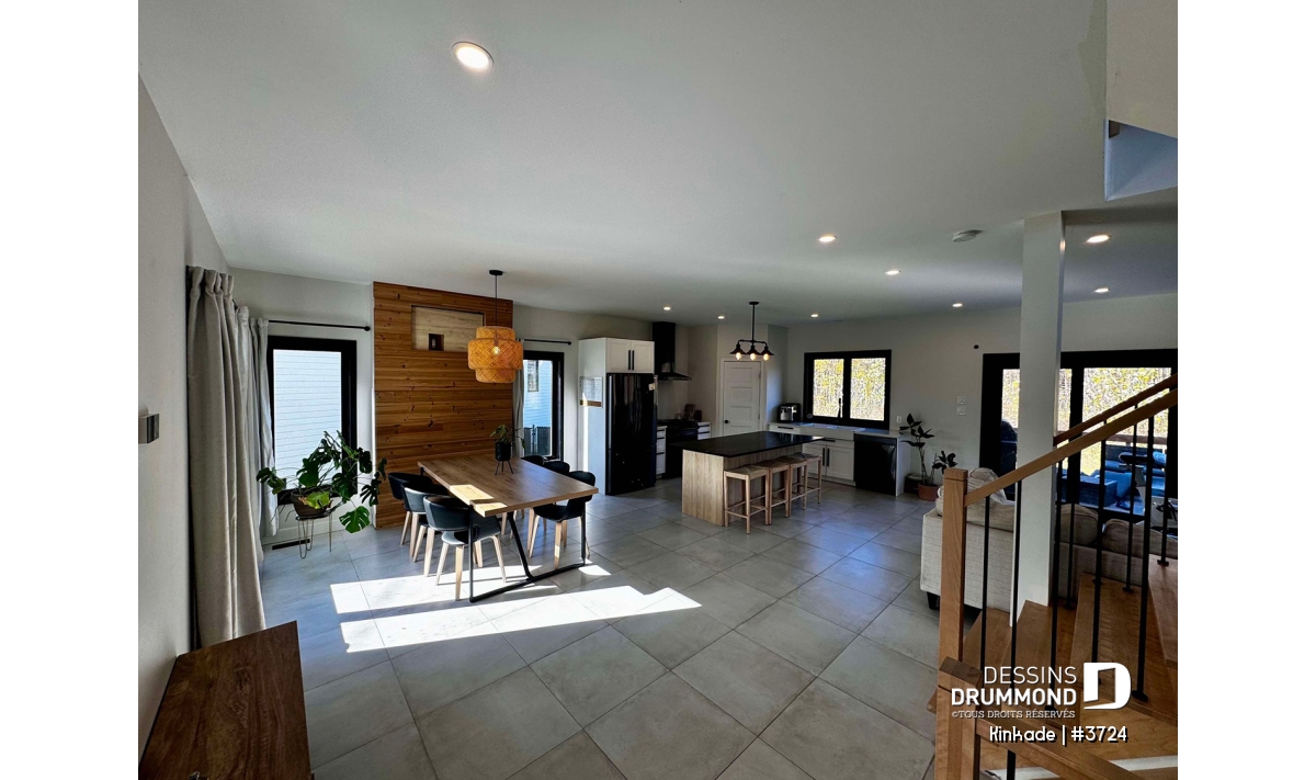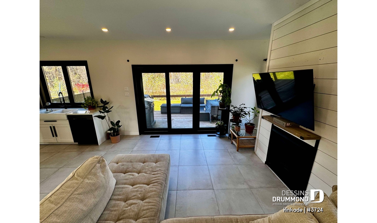 Salon ouvert sur la cuisine et proposant une porte-patio triple.