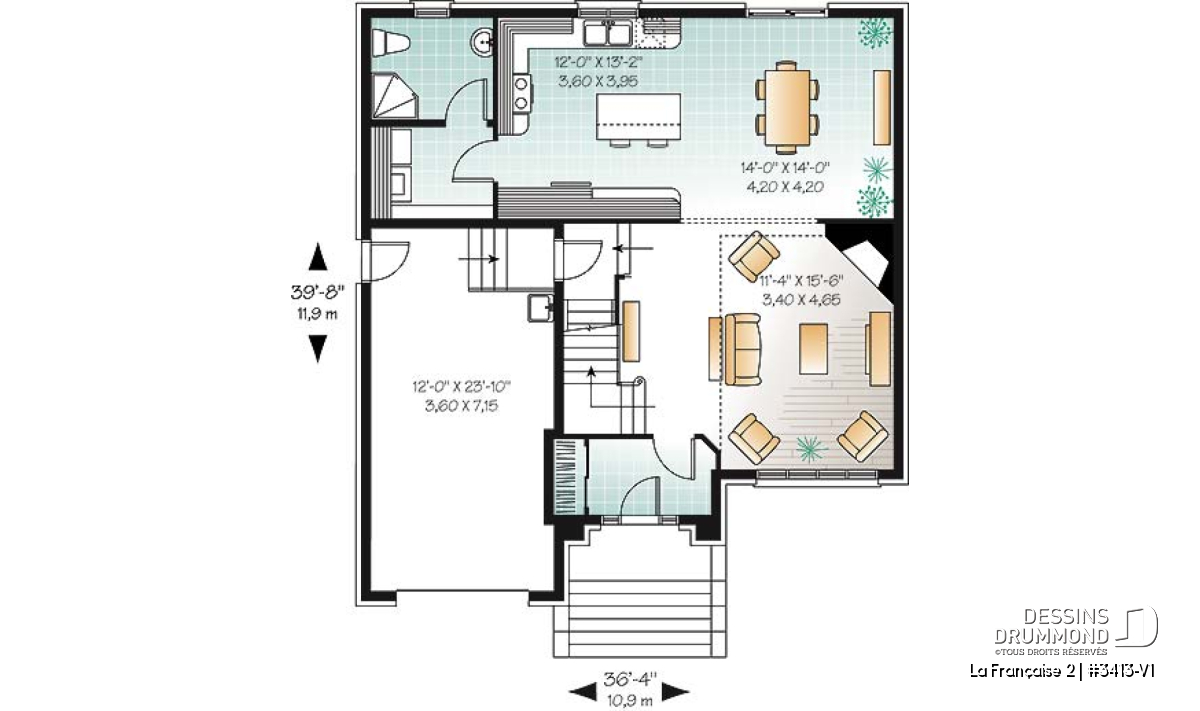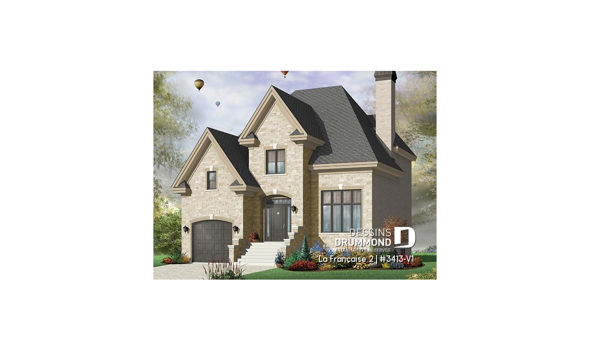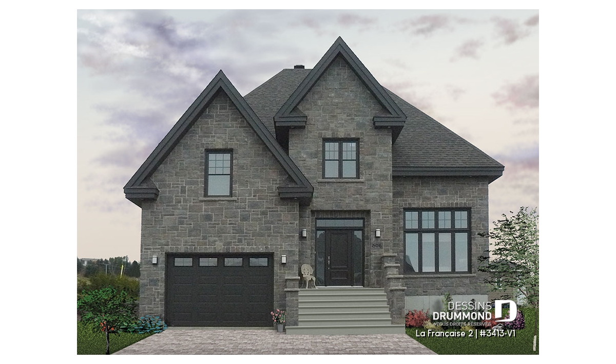 Ce remarquable plan de maison de style européen séduira immédiatement les familles à la recherche d’un espace à la fois élégant, lumineux et parfaitement adapté à la vie moderne. Conçu pour offrir plus de confort et de possibilités que le modèle original 3413 présenté sur dessinsdrummond.com, cette version bonifiée propose près de 250 pi² additionnels et une qualité architecturale supérieure, notamment grâce à la maçonnerie présente sur les quatre façades. La pierre et la brique subliment la façade principale, tandis que les autres murs entièrement en brique remplacent avantageusement l’enduit acrylique du modèle initial, conférant une allure plus noble et durable à l’ensemble.