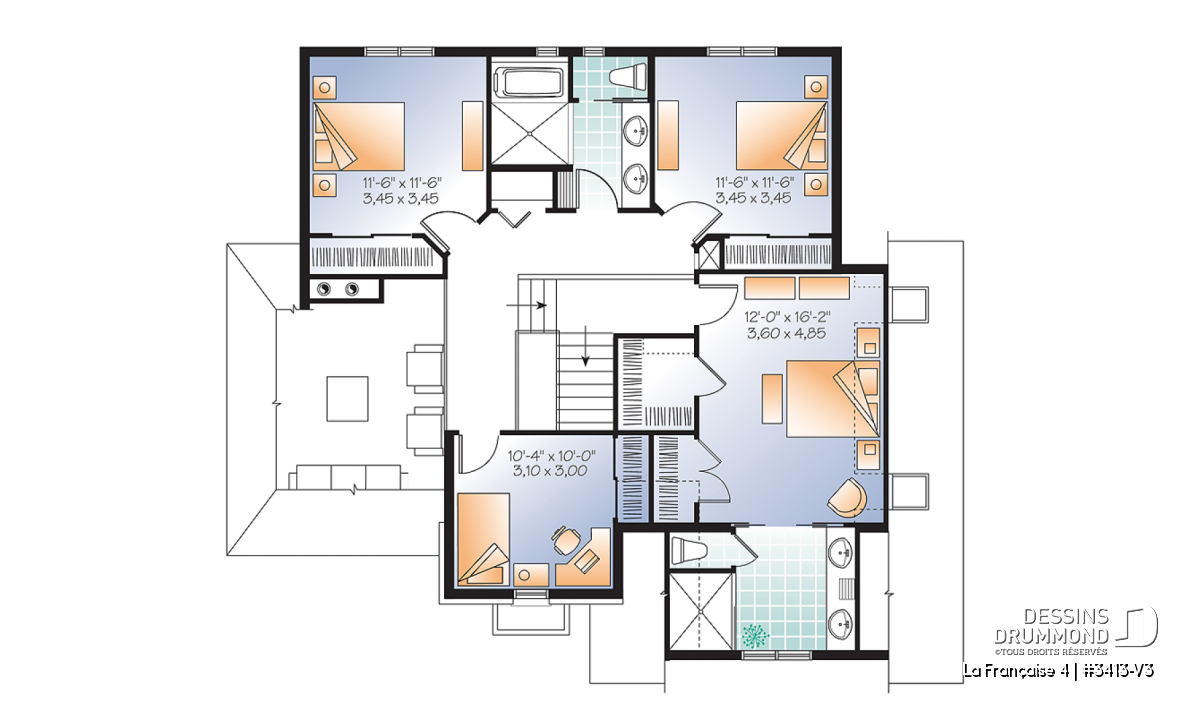 Réalisé à partir du plan similaire 3413-V2, ce plan 3413-V3 se veut encore plus imposant avec son garage double et d’autant plus confortable avec l’addition d’une 4è chambre à l’étage dont une suite des maîtres remarquable aménagée au-dessus du garage. Entrons donc sans plus tarder!