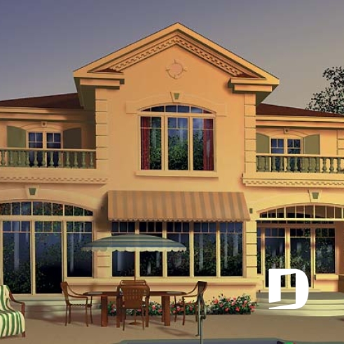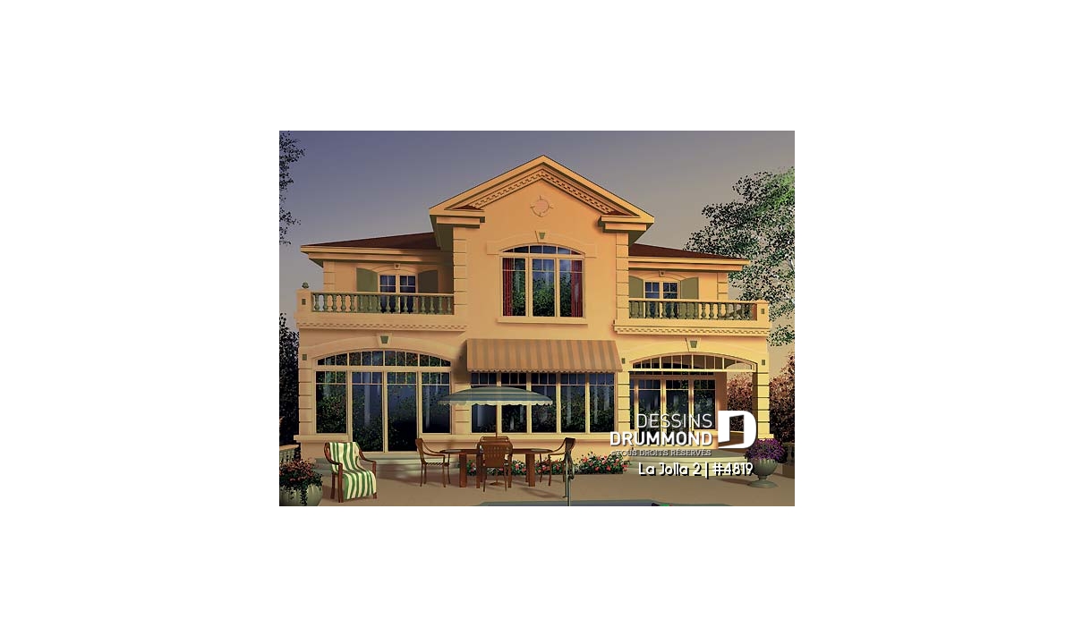 Vue arrière - MODÈLE DE BASE - Plan de maison style Floride, 4 grandes chambres, solarium, plafond 9', 2 balcons, garage - La Jolla 2
