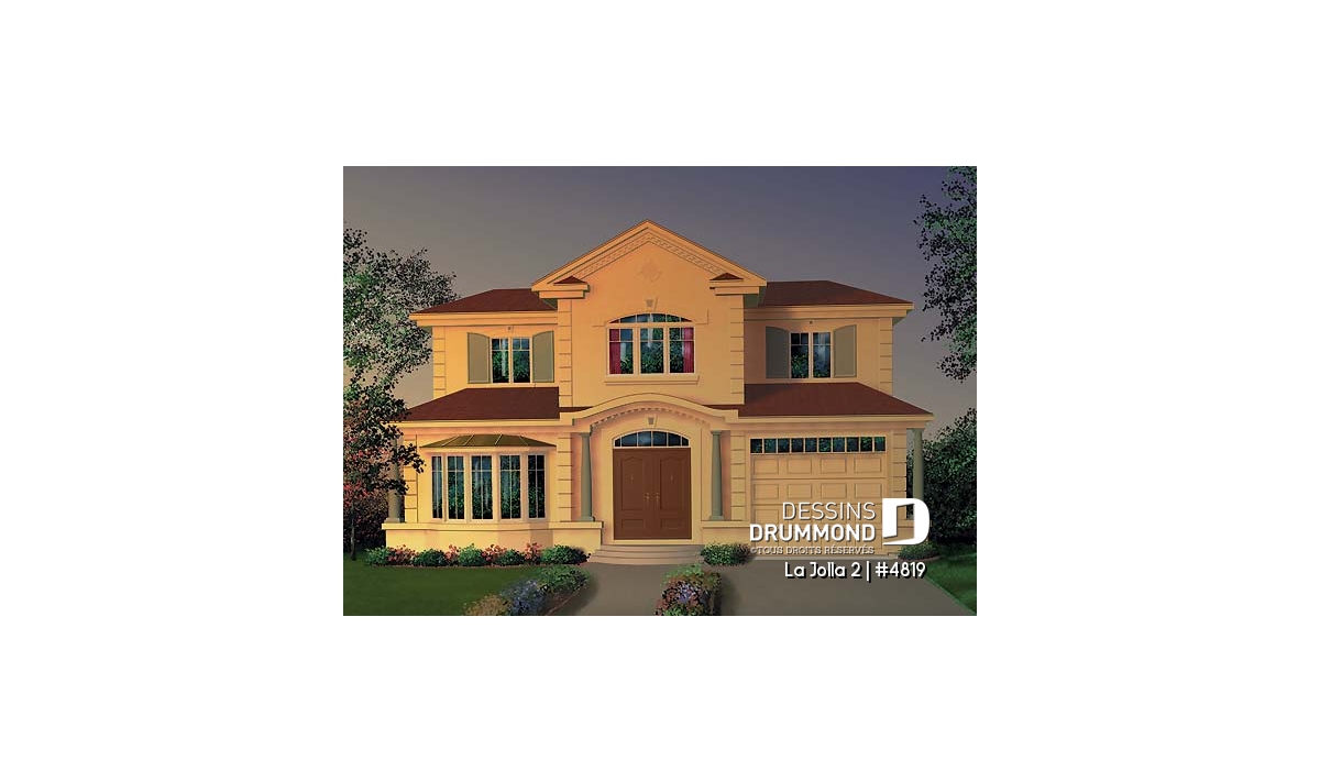 Plan de maison style Floride, 4 grandes chambres, solarium, plafond 9', 2 balcons, garage