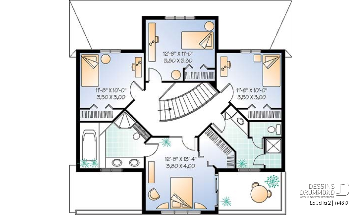 Étage - Plan de maison style Floride, 4 grandes chambres, solarium, plafond 9', 2 balcons, garage - La Jolla 2