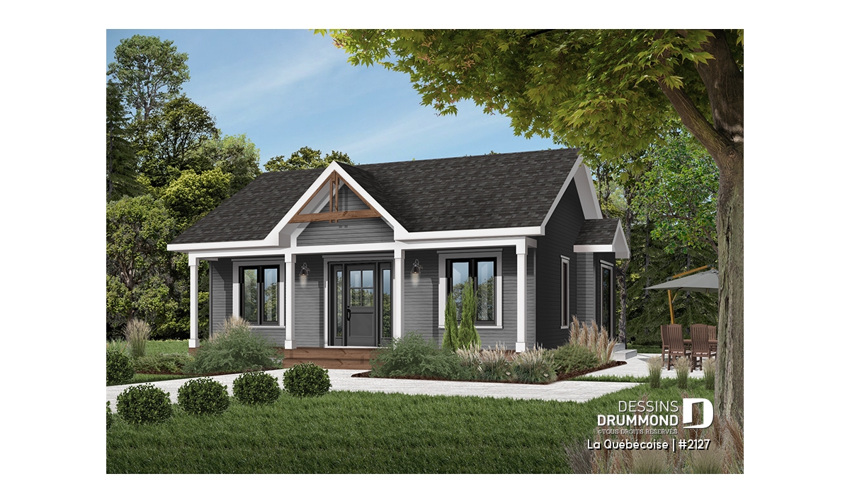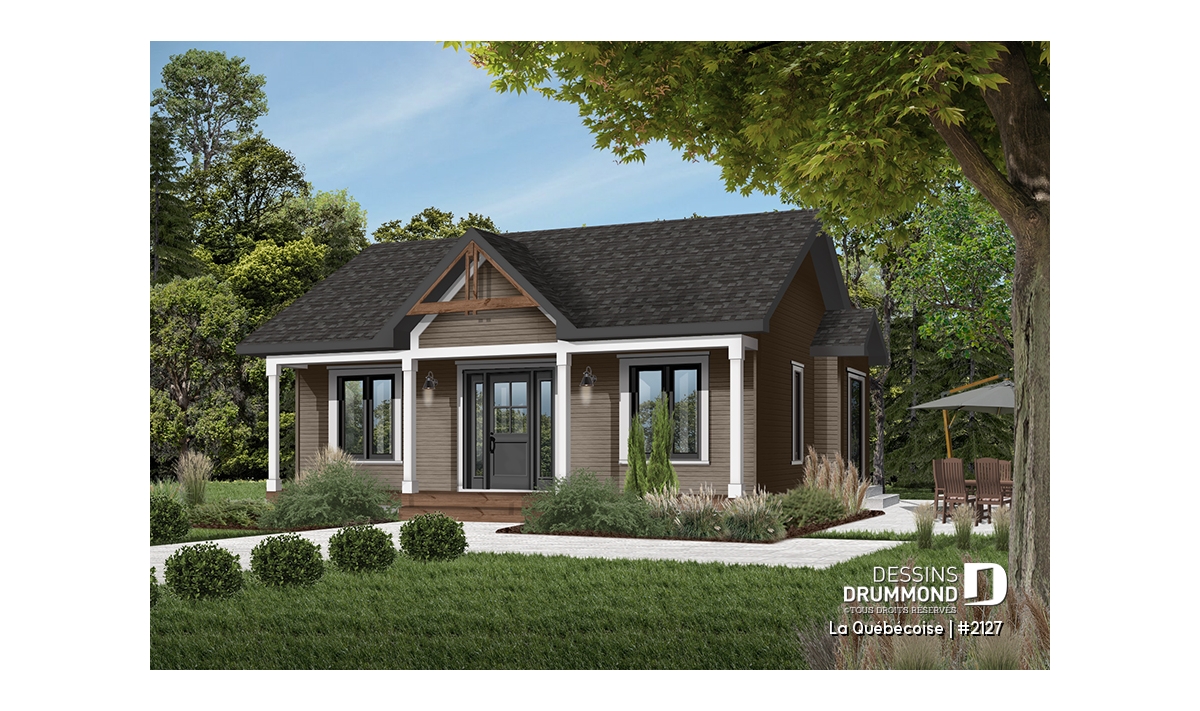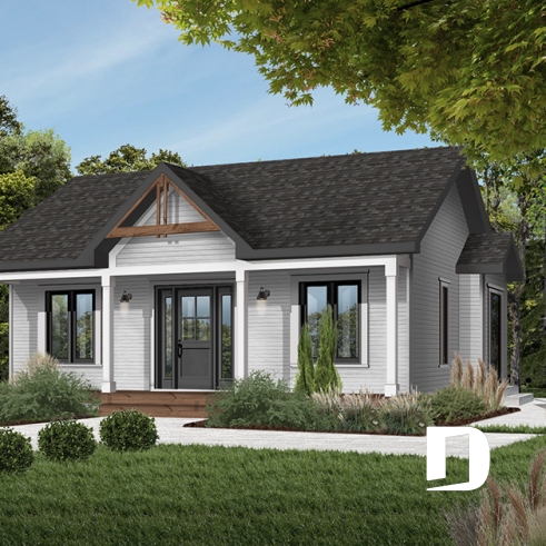 Plan de maison abordable 2 chambres, style campagne, galerie avant couverte, aire ouverte, sous-sol à aménager