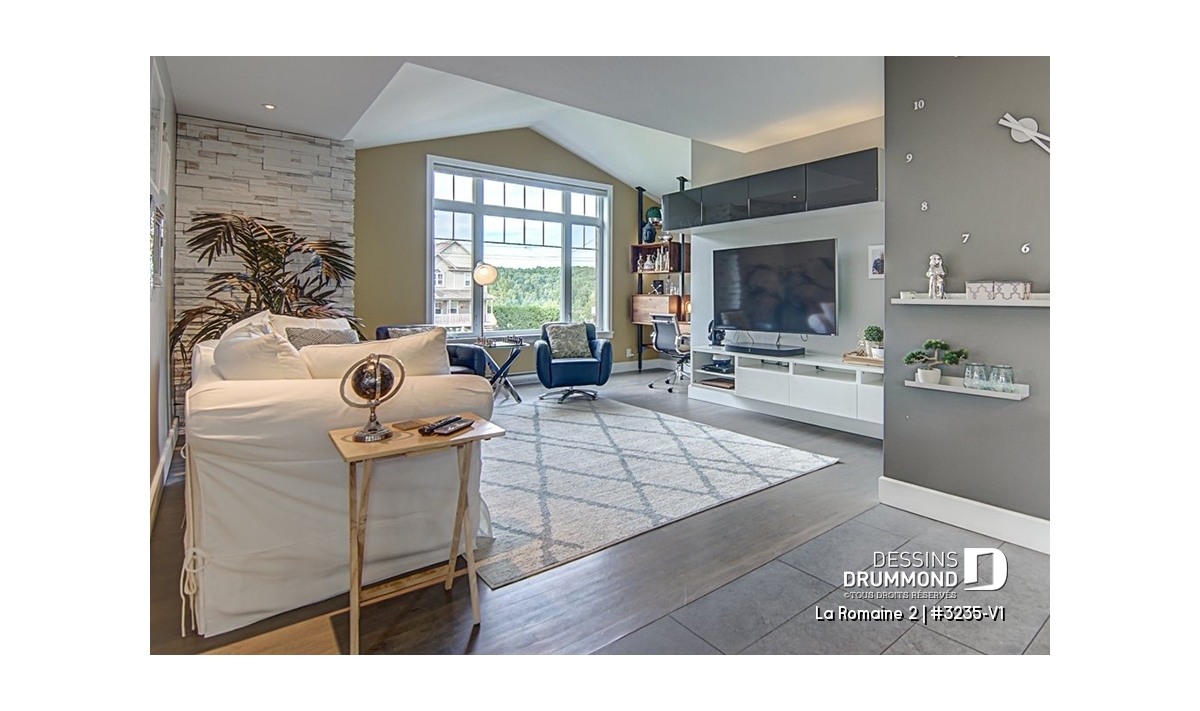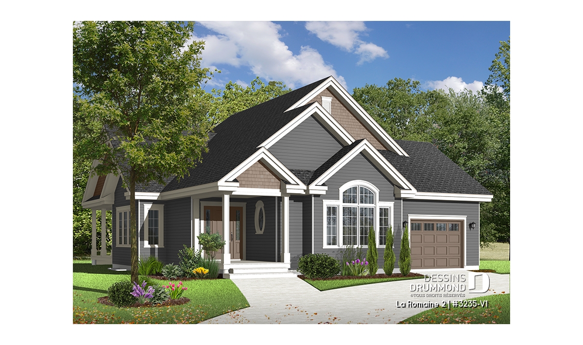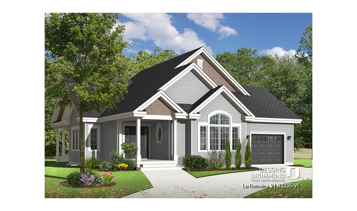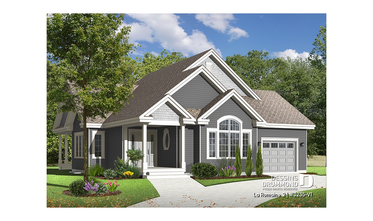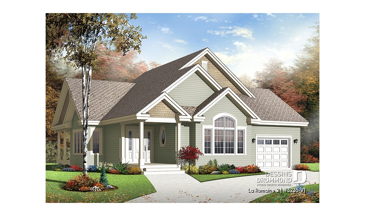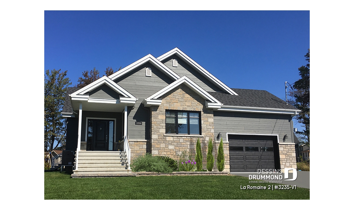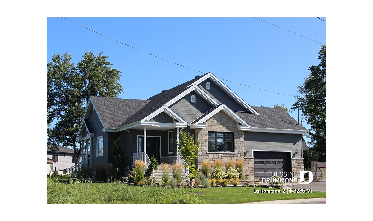 Considéré comme l’un des plans de plain-pied les plus populaires, et entre autres en raison de ses trois chambres sur un même plancher, le plan 3235 dont origine ce modèle version nous fut d’ailleurs suggéré comme pouvant être agrandi légèrement afin d’obtenir tout au moins un garage plus logeable. Voici donc ce 3235-V1 agrandi de 2 pieds en largeur !