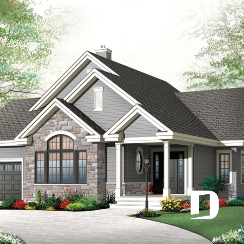 Plan de maison plain-pied Craftsman avec garage et patio couvert.