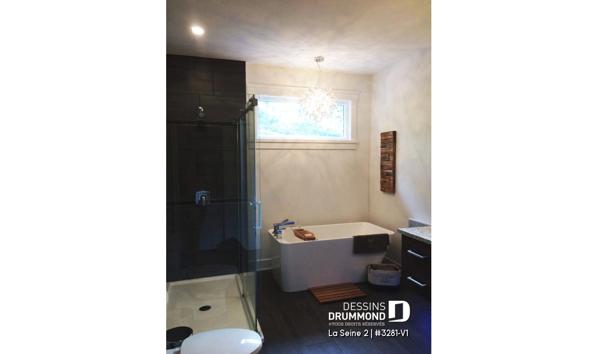 Salle de bain avec bain autoportant, grande douche de 5pi x 3pi, vanité de 6pi.