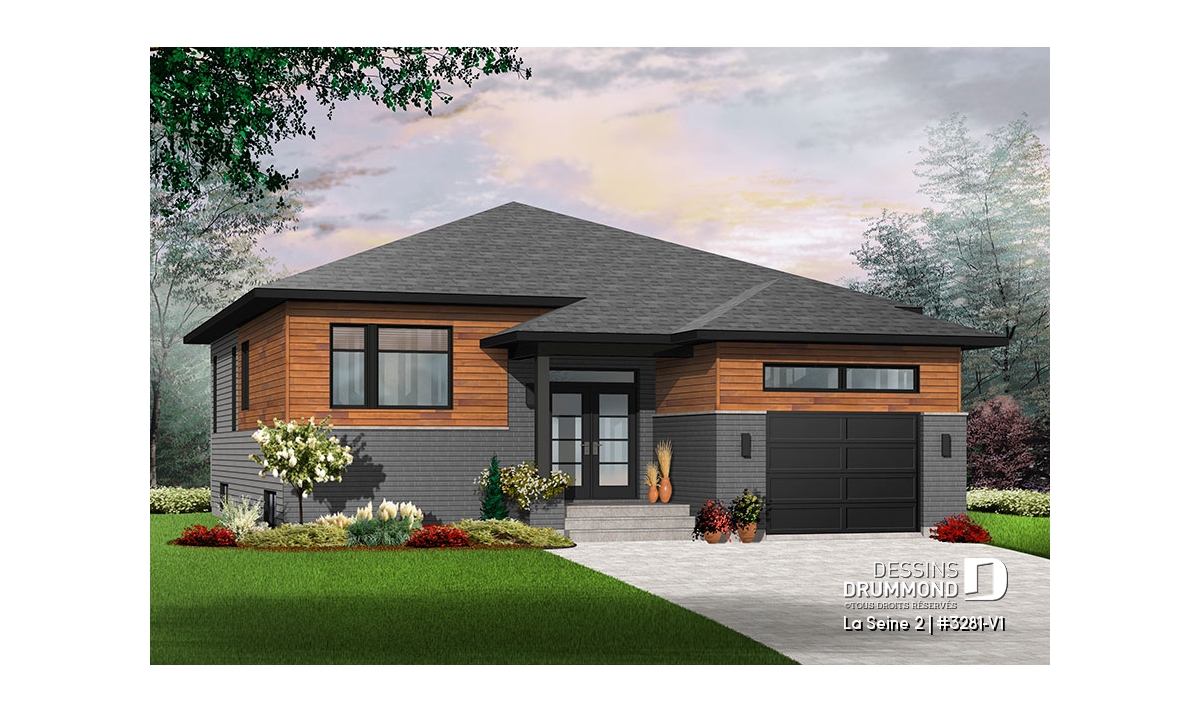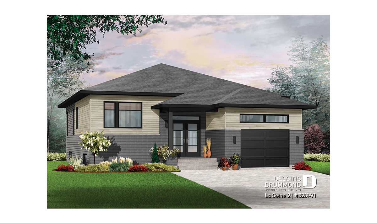 Plan de maison de plain-pied, style moderne avec garage.