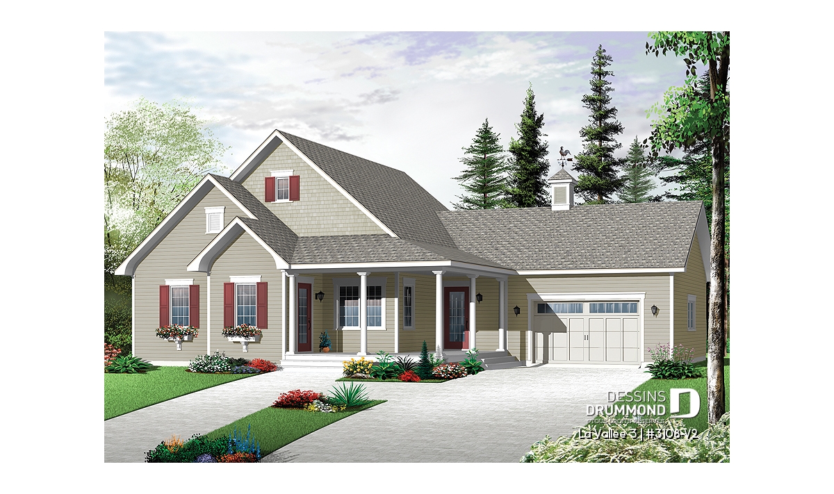 Vue avant - MODÈLE DE BASE - Plan de plain-pied 2 chambres avec garage, coin ordinateur, accès s-sol par garage, vestibule fermé - La Vallée 3