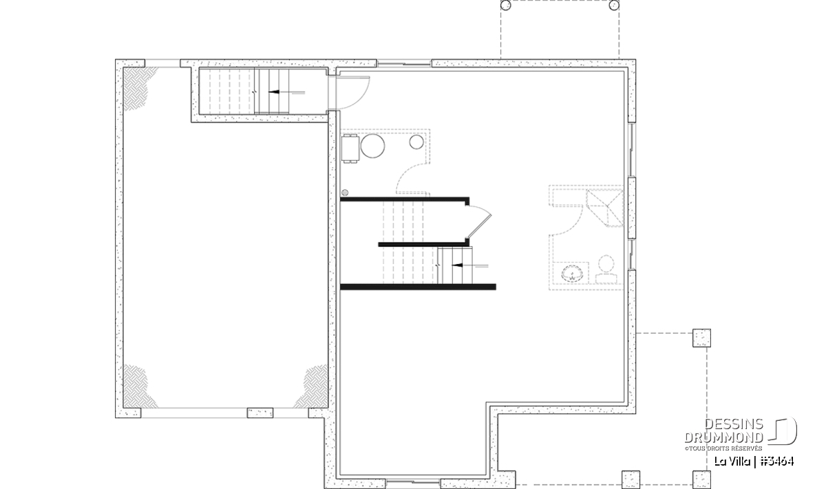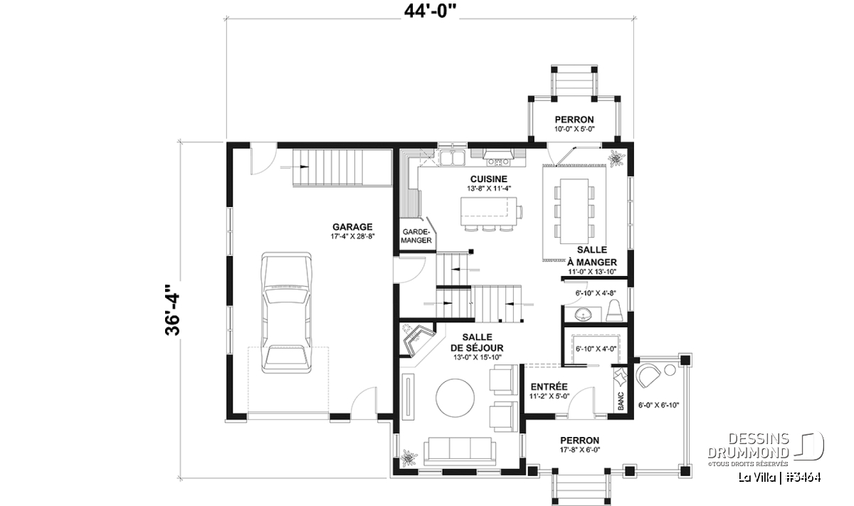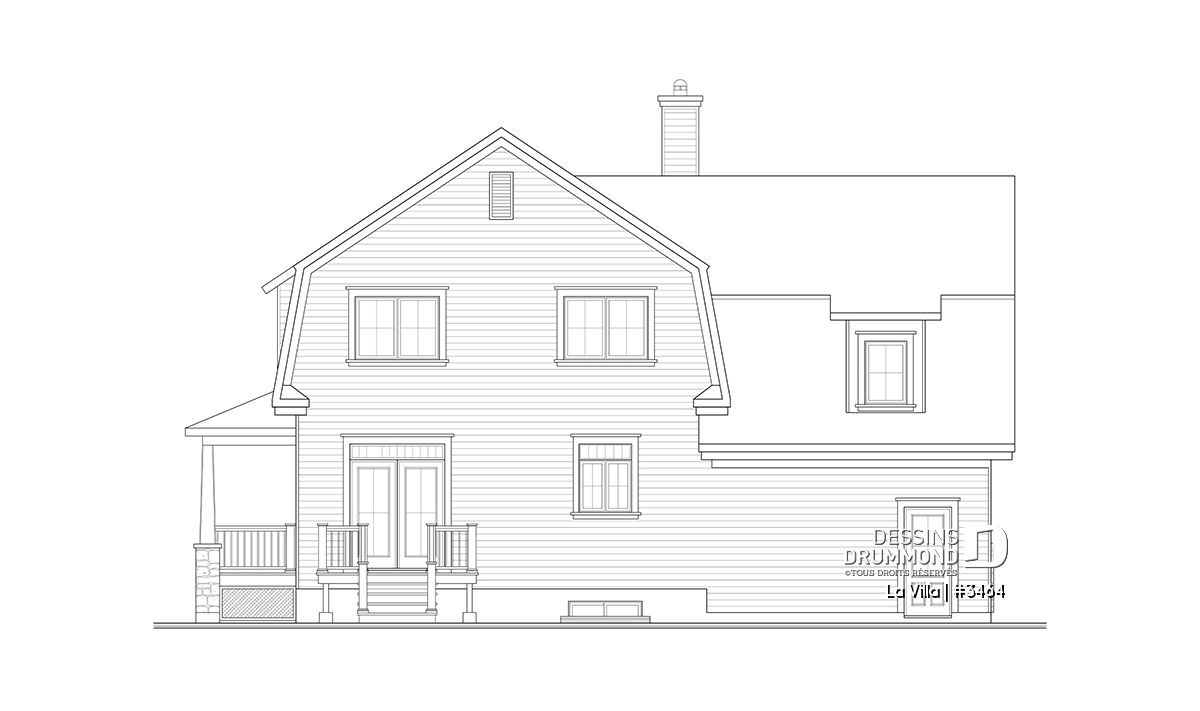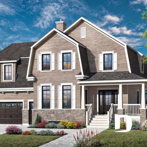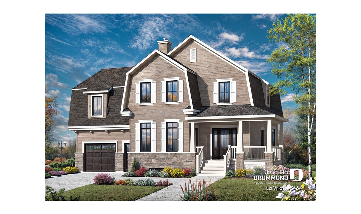 Le plan de maison LA VILLA (plan #3464) propose 2297 pi.ca. aménagés sur 2 étages, excluant le sous-sol qui n'est pas aménagé. Dans le but de combler les besoins en chambres de certaines familles, comme celles reconstituées, Dessins Drummond propose ici un modèle mansardé fort logeable pour lequel on assiste à un bien heureux mariage d’un garage de 17’4'' x 28’8'' à une maison bien aménagée pour une grande famille. Sans oublier cette galerie couverte, en façade principale, qui procure une touche bien invitante à l’ensemble.