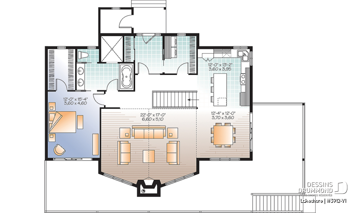 À l’intérieur, le fait de s’adresser à ces amateurs de sports oblige l’aménagement d’un coin buanderie/séchoir avec rangement adéquat et ce, tout près de l’entrée. Puis, c’est un secteur activités entièrement ouvert avec plafond à 9’ qui s’offre à nous une fois le vestibule franchi. De plus, sur ce plancher, on apprécie une cuisine avec îlot central de 36po x 90po, une vaste salle de séjour avec foyer et plafond cathédrale et une chambre des maîtres avec garde-robe walk-in et accès à une salle de bain proposant : vanité double, toilette en cabine et douche de 5’ x 6’.
