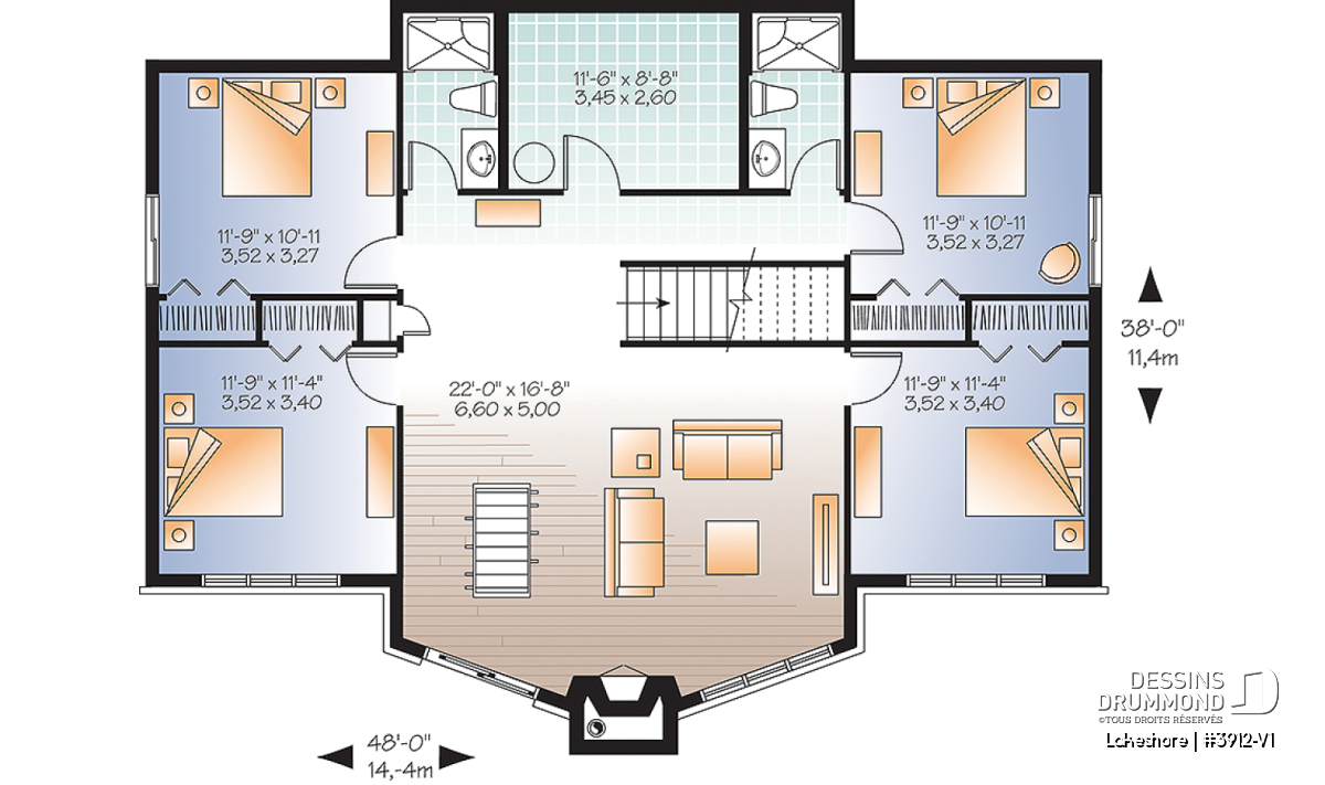 Au sous-sol, tout de même exposé entièrement à l’arrière, on est agréablement surpris par la présence de 4 chambres avec lit double, de deux salles de douche, d’un atelier/rangement et d’une grande salle familiale avec foyer et luminosité pour un modèle version fort approprié.