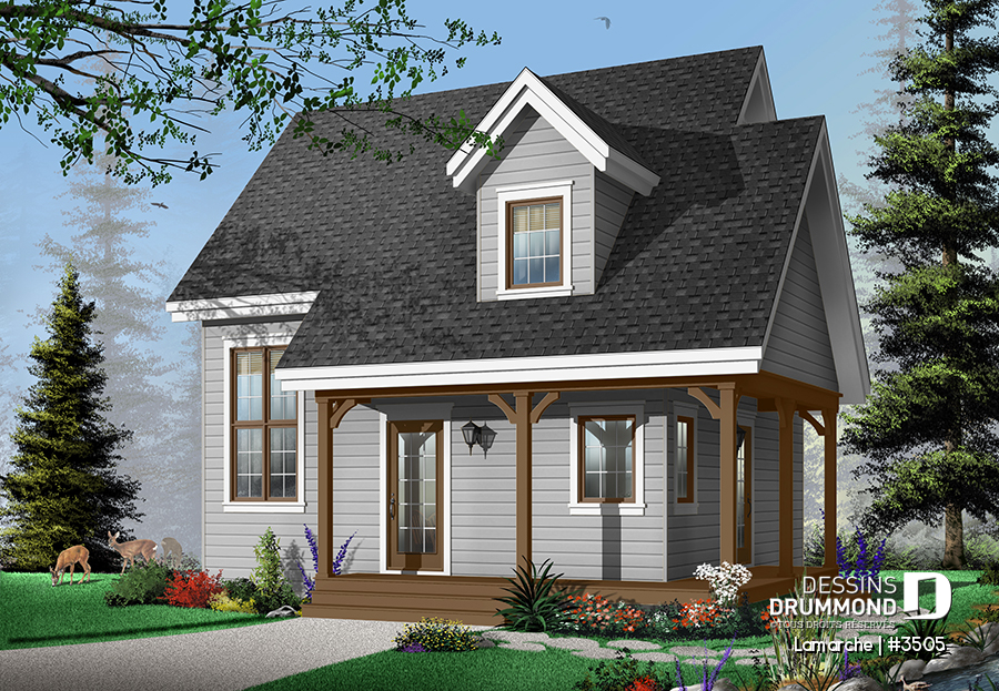 Plan de maison de style champêtre, aire ouverte au rez-de-chaussée, 2 chambres, galerie couverte, foyer