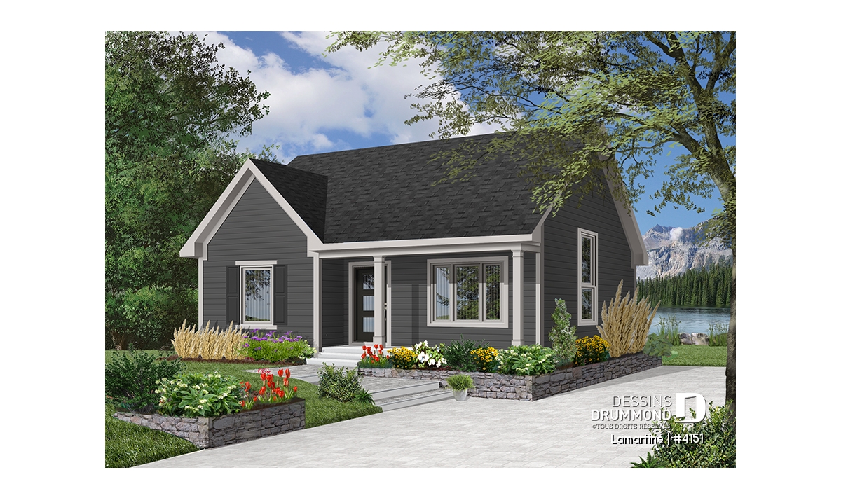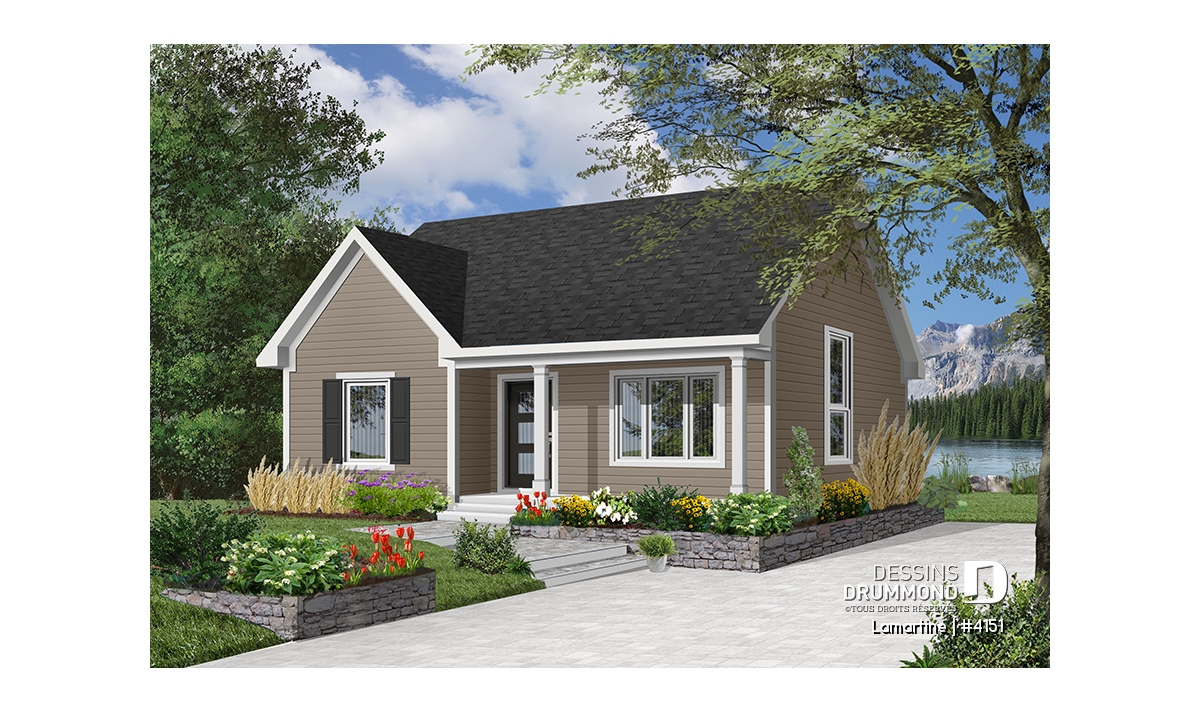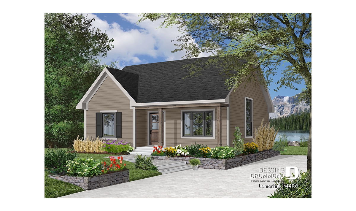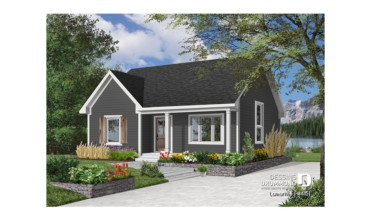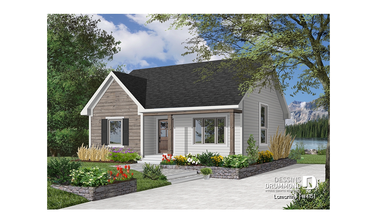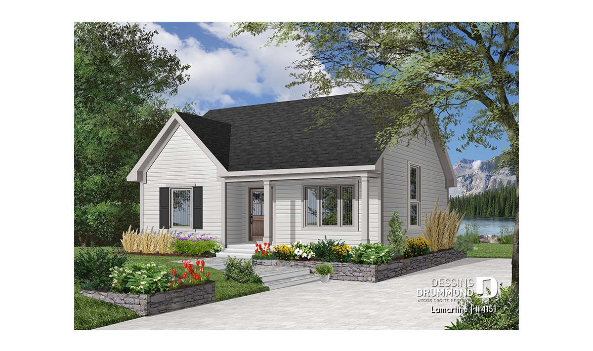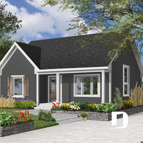 Plan de petit bungalow abordable de 2 chambres avec plafond cathédrale, et style campagne