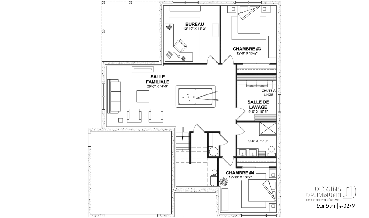 *Si vous souhaitez acheter le plan du sous-sol aménagé, tel que présenté sur la page de ce plan, veuillez sélectionner cette option dans le panier d'achat, dans la section "Sélectionner votre fondation". Si vous ne sélectionnez pas cette option, vous recevrez le sous-sol non fini, sans frais additionnel.