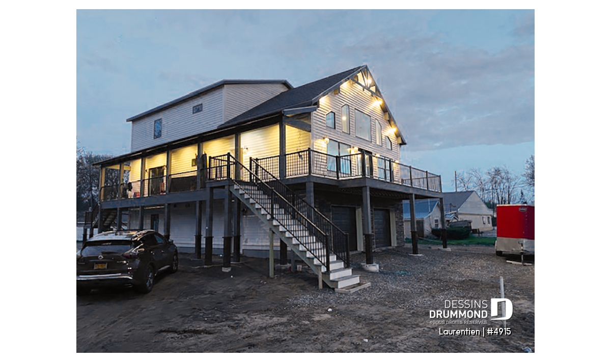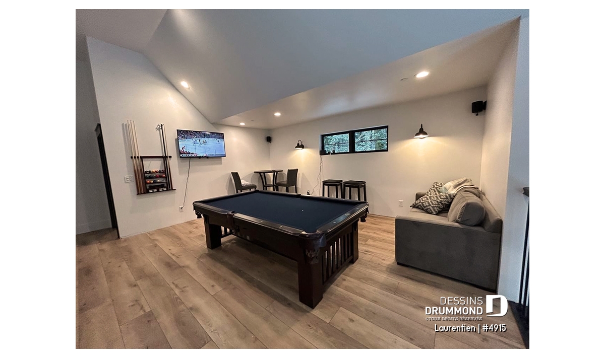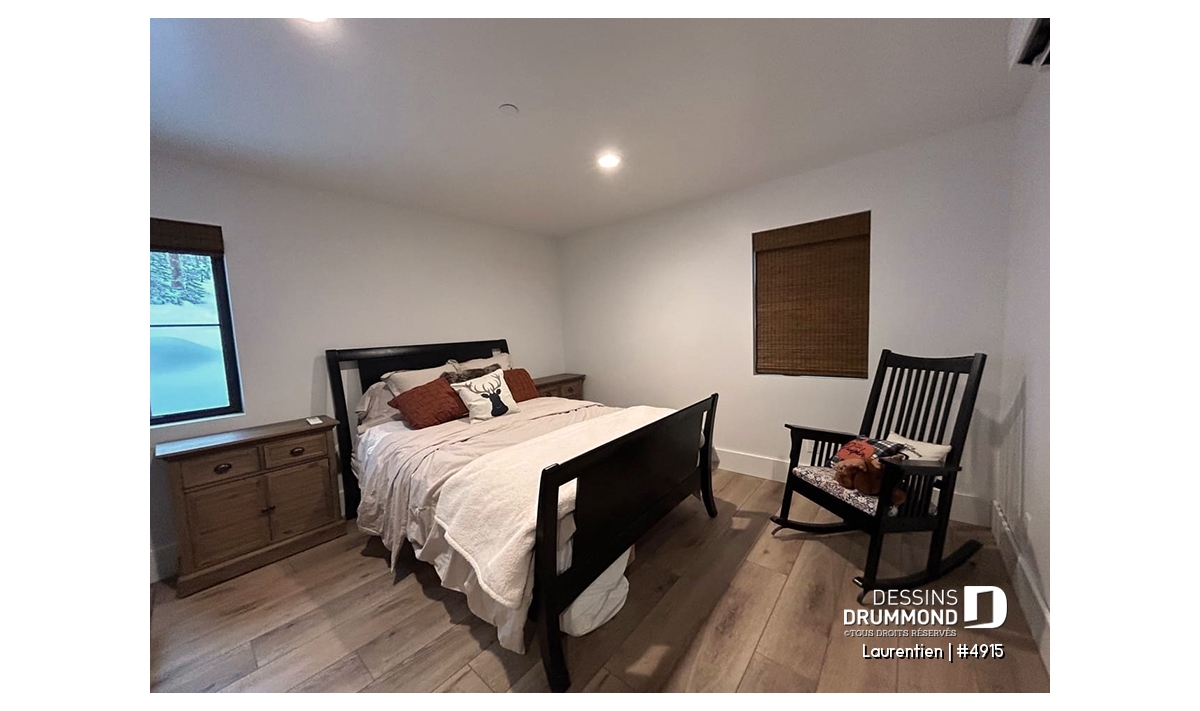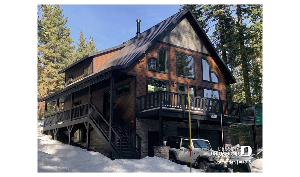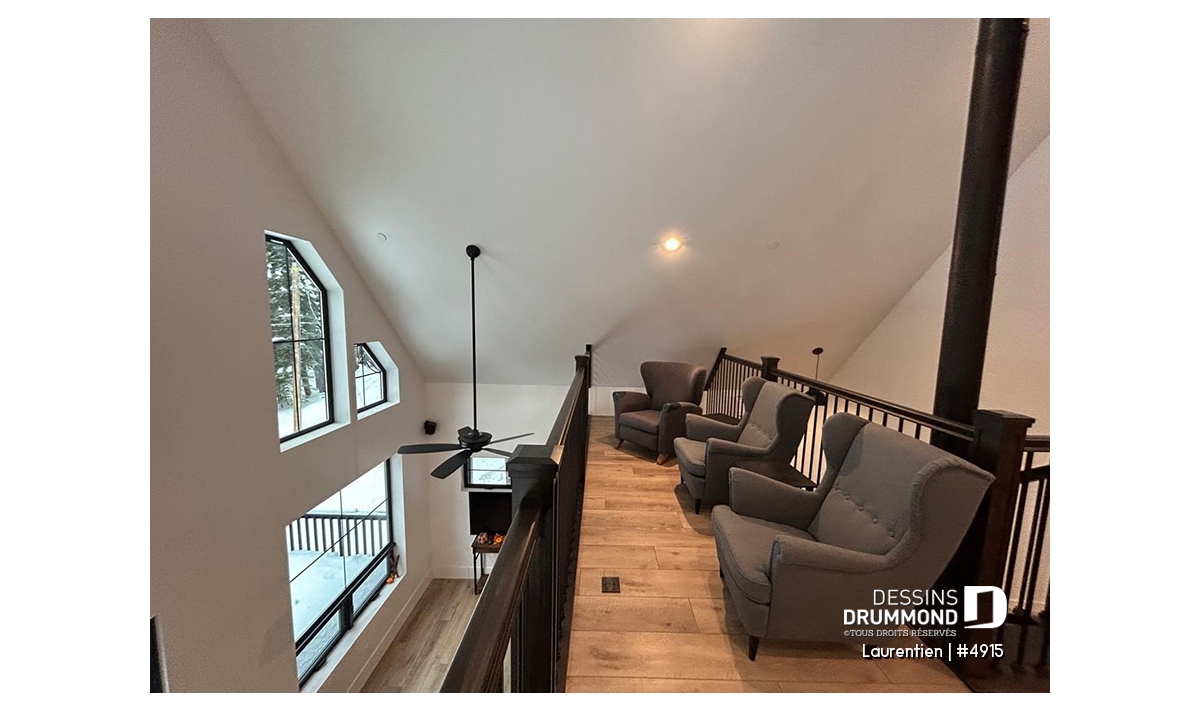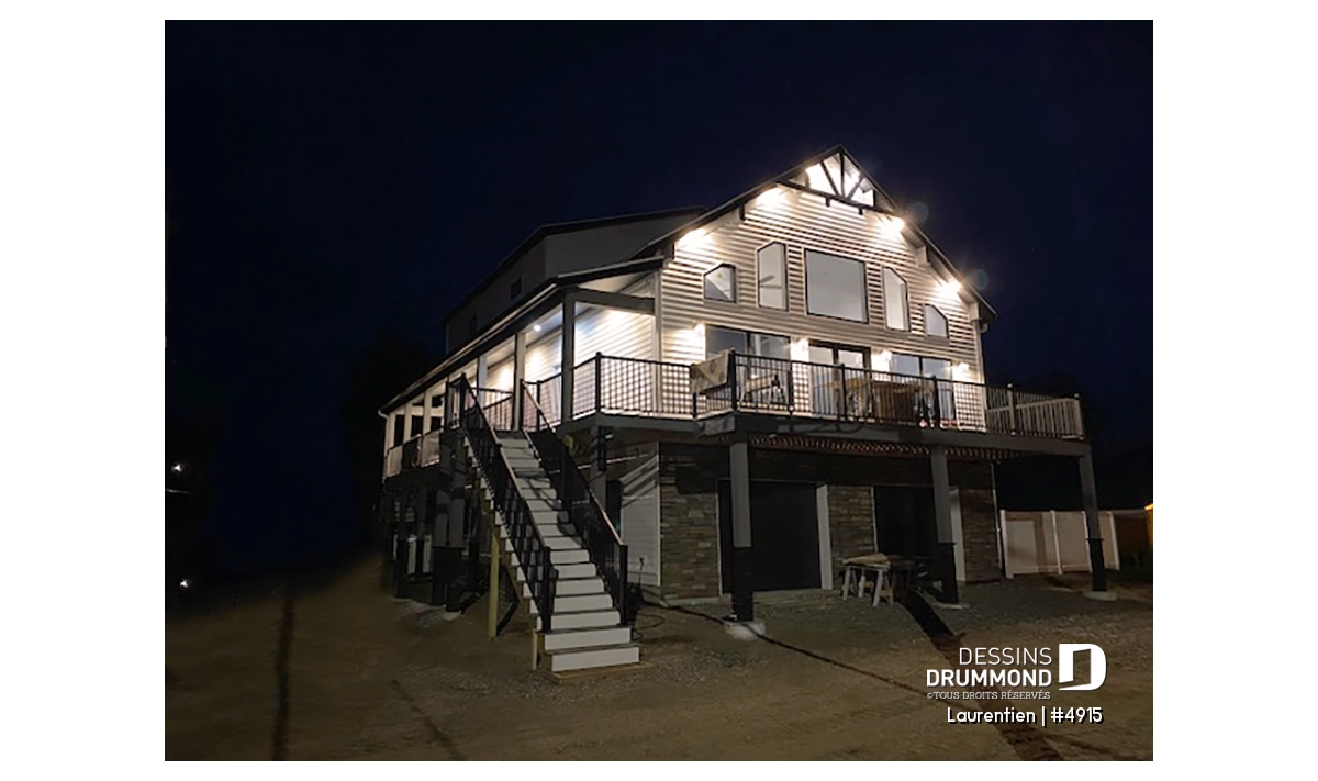 Ce plan de chalet no. 4915 (Laurentien) propose plus de 2055 pieds carrés de surface aménagée. Pratique pour ses 4 chambres à coucher, dont la chambre principale au rez-de-chaussée, il inclut aussi un grand espace à aménager en salle familiale ou en chambre loft (#5) au besoin à l'étage.