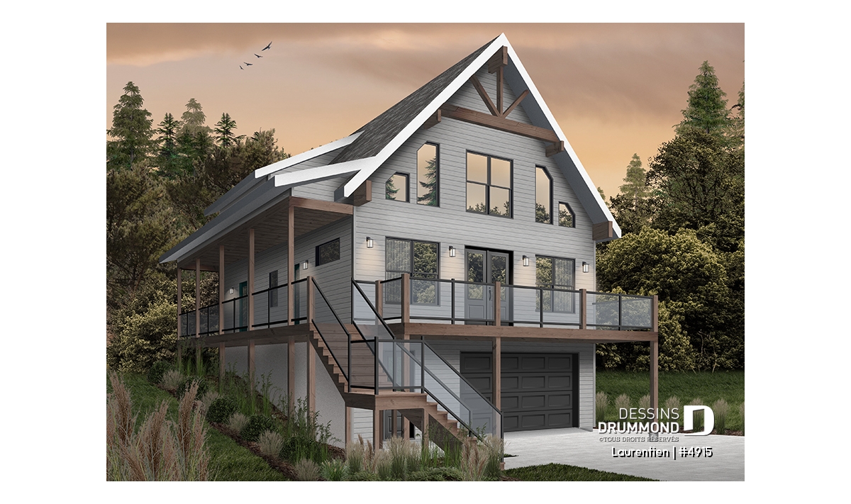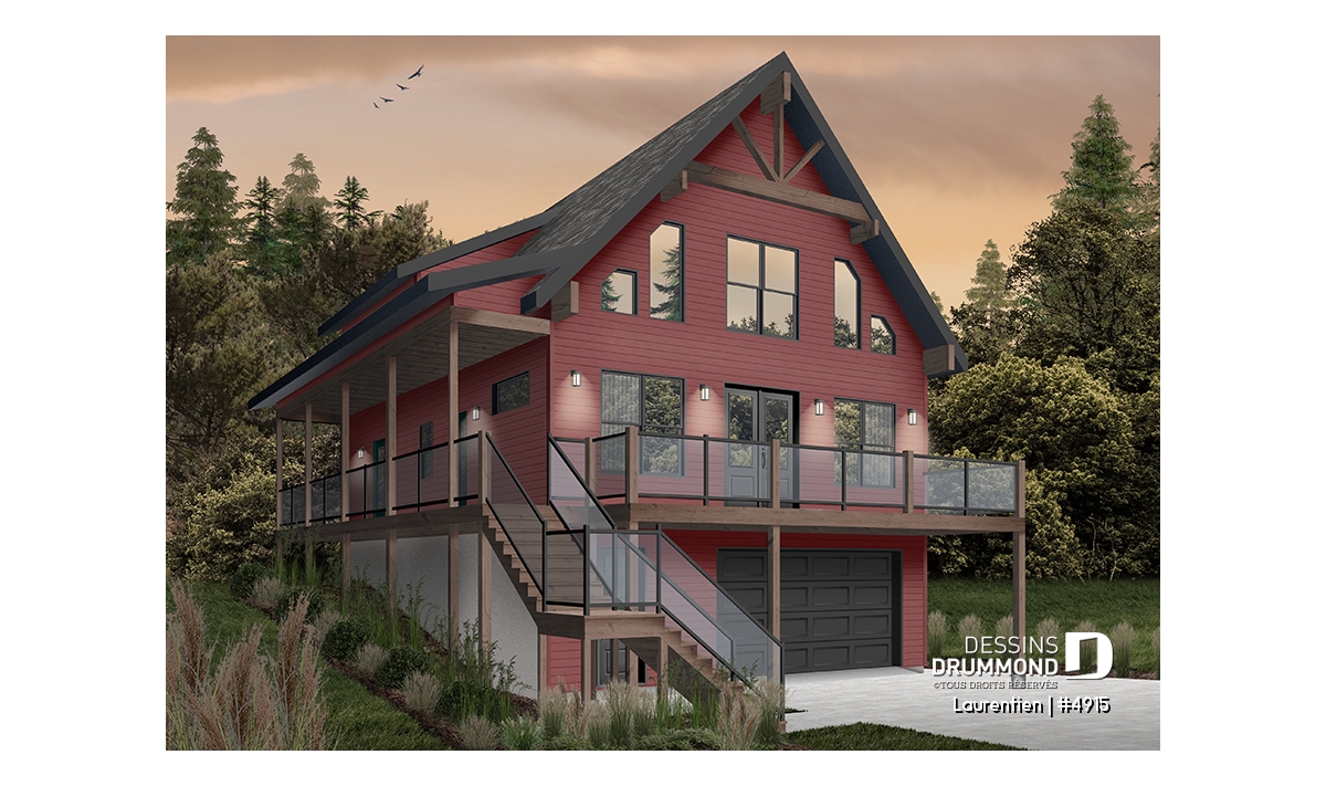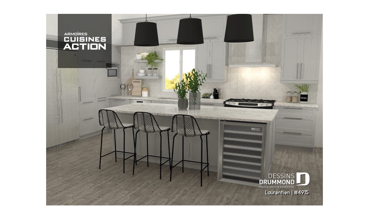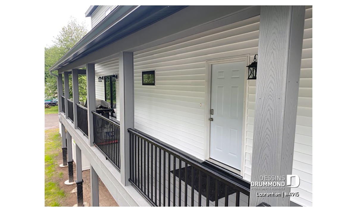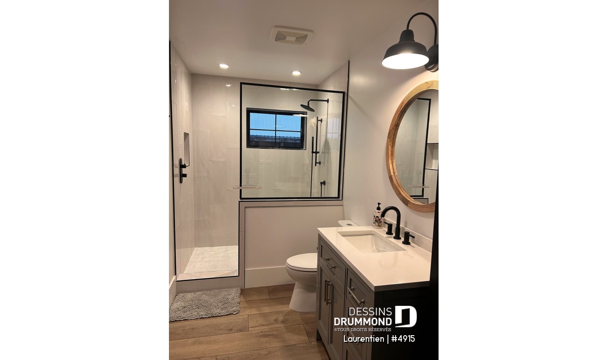 Ce plan de chalet no. 4915 (Laurentien) propose plus de 2055 pieds carrés de surface aménagée. Pratique pour ses 4 chambres à coucher, dont la chambre principale au rez-de-chaussée, il inclut aussi un grand espace à aménager en salle familiale ou en chambre loft (#5) au besoin à l'étage.