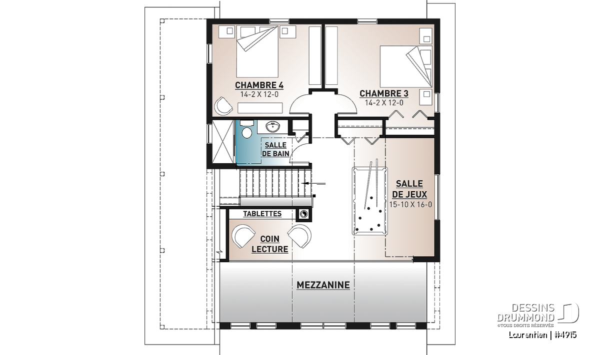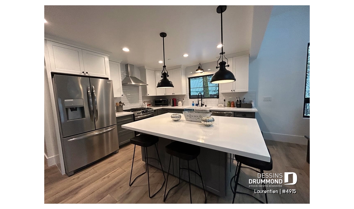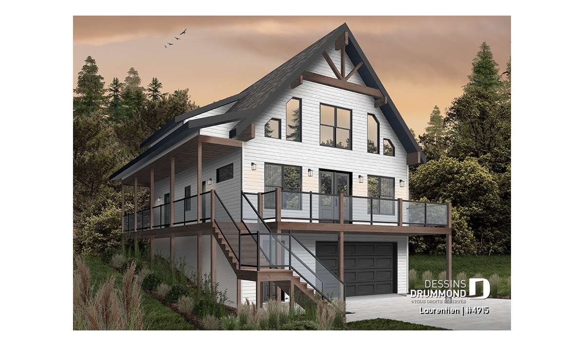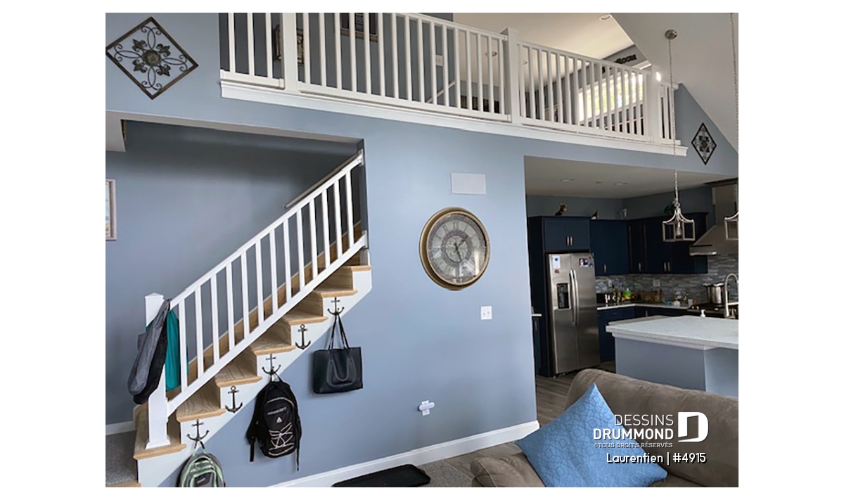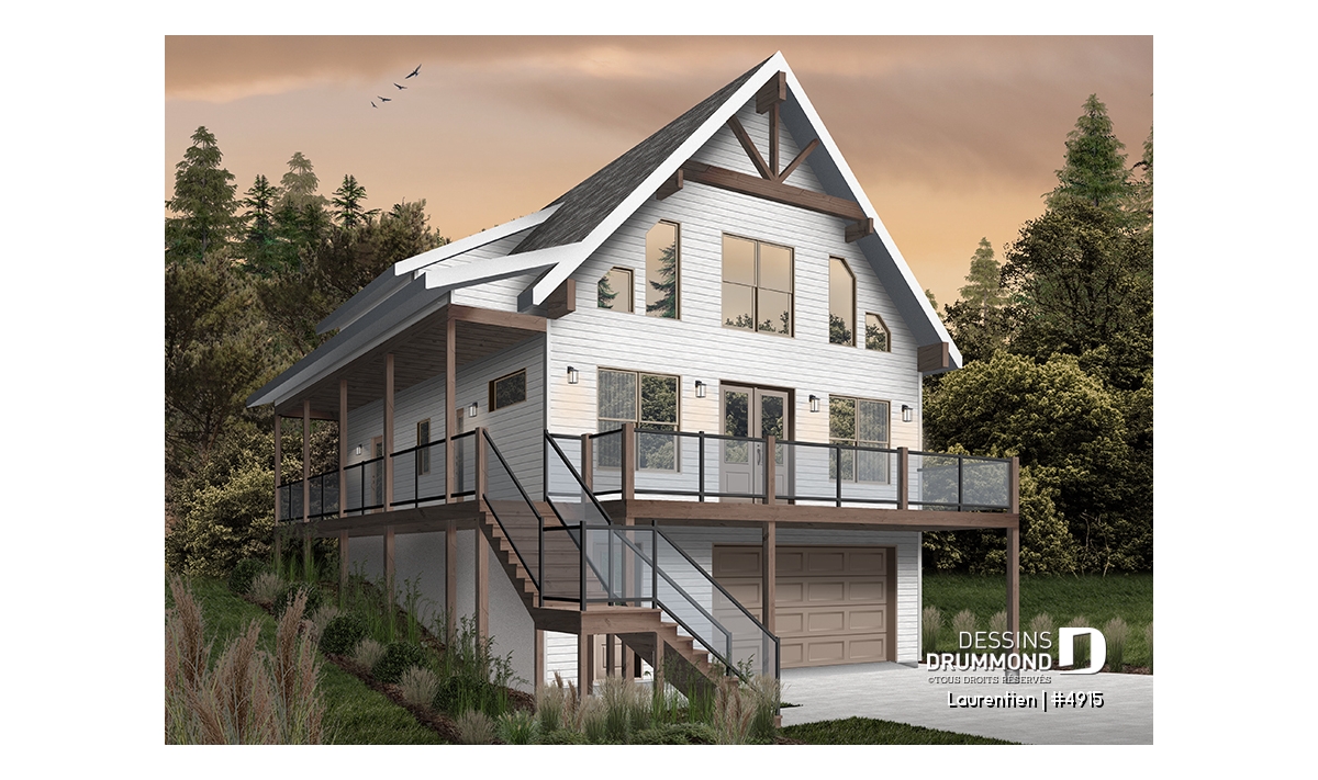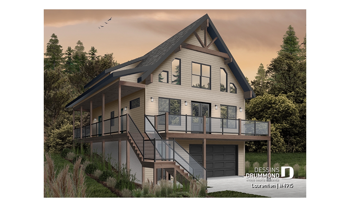 Ce plan de chalet no. 4915 (Laurentien) propose plus de 2055 pieds carrés de surface aménagée. Pratique pour ses 4 chambres à coucher, dont la chambre principale au rez-de-chaussée, il inclut aussi un grand espace à aménager en salle familiale ou en chambre loft (#5) au besoin à l'étage.