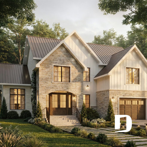 • Utilisation de pierre et de revêtement Board & Batten pour une façade chaleureuse