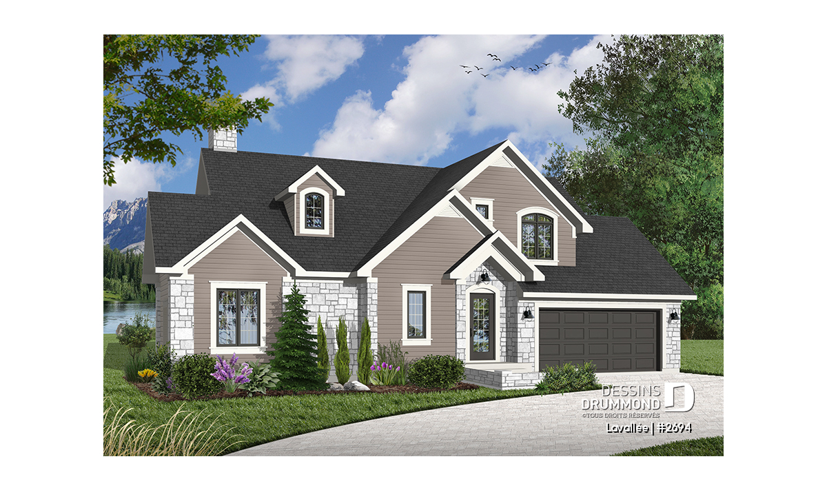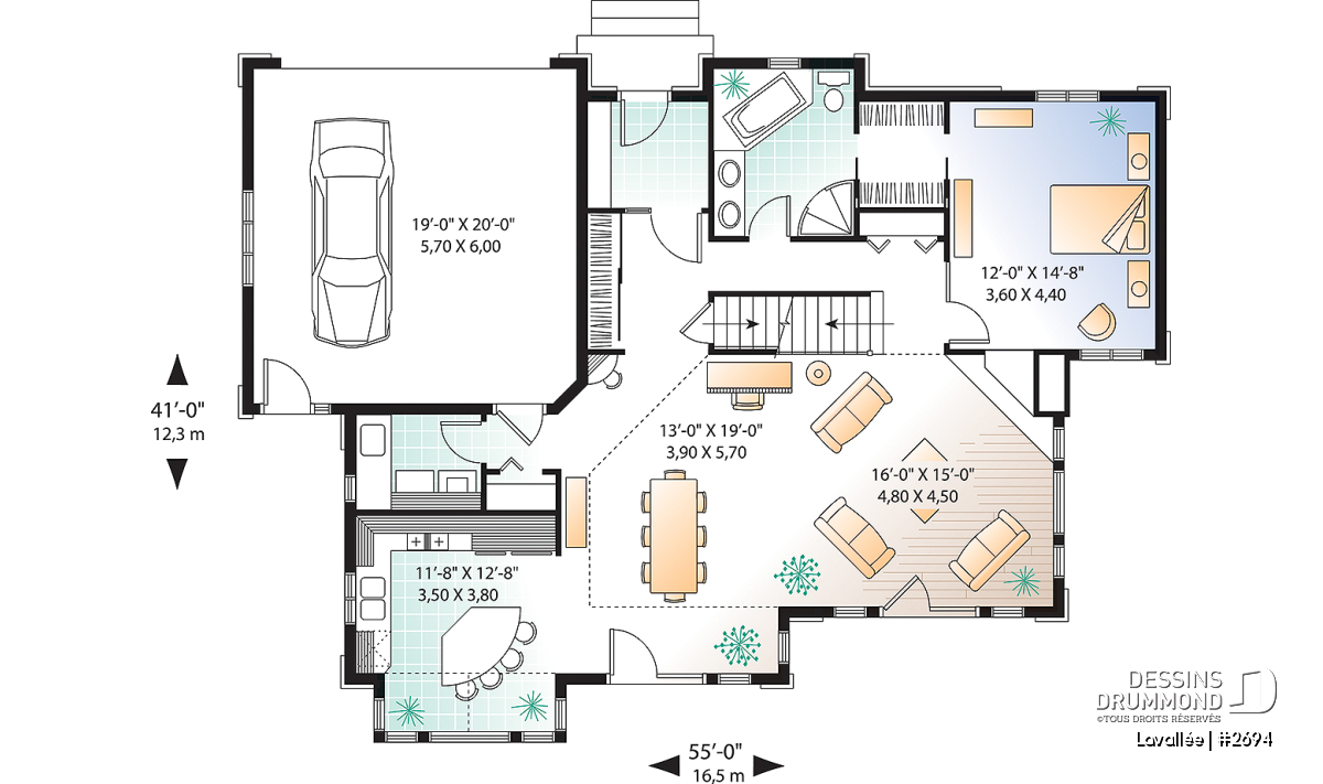 C’est assez difficile à croire, mais ce rez-de-chaussée offre une vue panoramique de la cuisine, de la dînette, de la salle à manger, de la salle de séjour et de la chambre des maîtres rencontrant ainsi la très fréquente demande de bien des futurs propriétaires à l’effet de maximiser la vue pour une maison à aménager aux abords d’un lac, d’une rivière ou de tout autre point de vue panoramique. Dessins Drummond vous propose d’ailleurs le modèle 3916, avec sous-sol aménagé, pour ceux dont le site est caractérisé par un certain dénivelé vers l’arrière.
