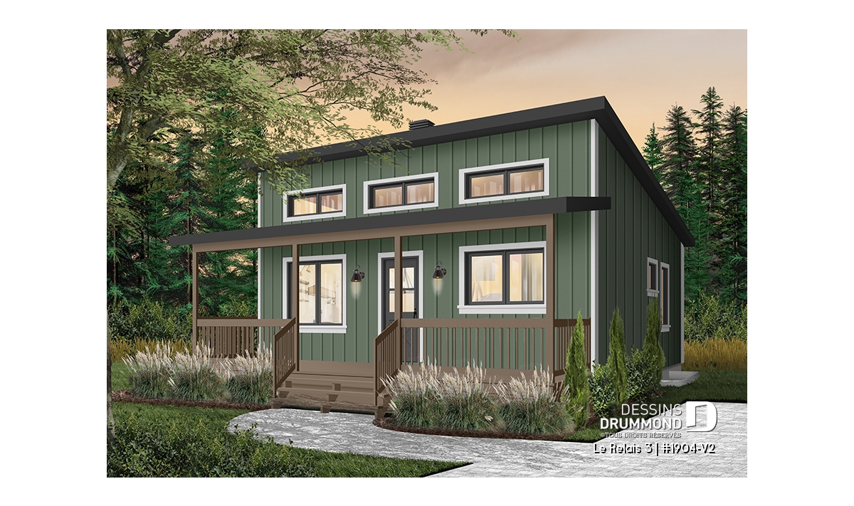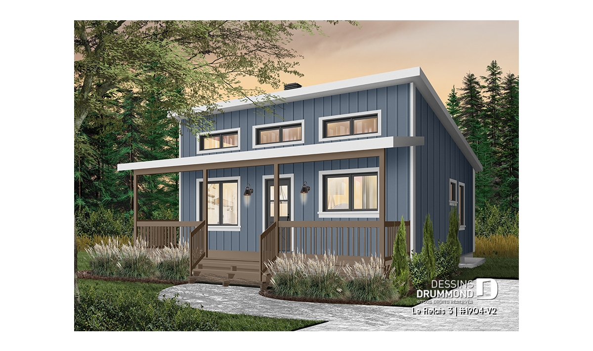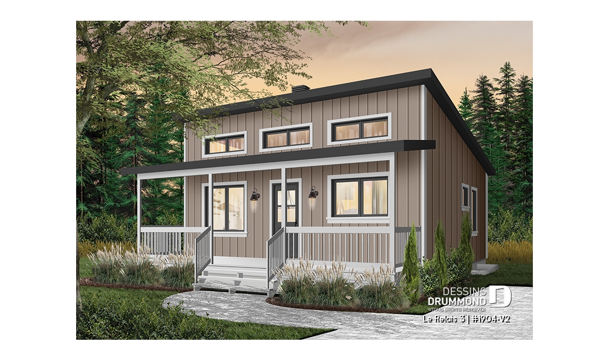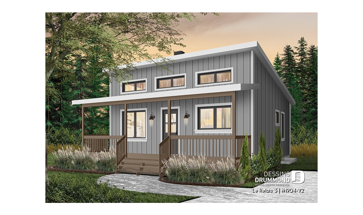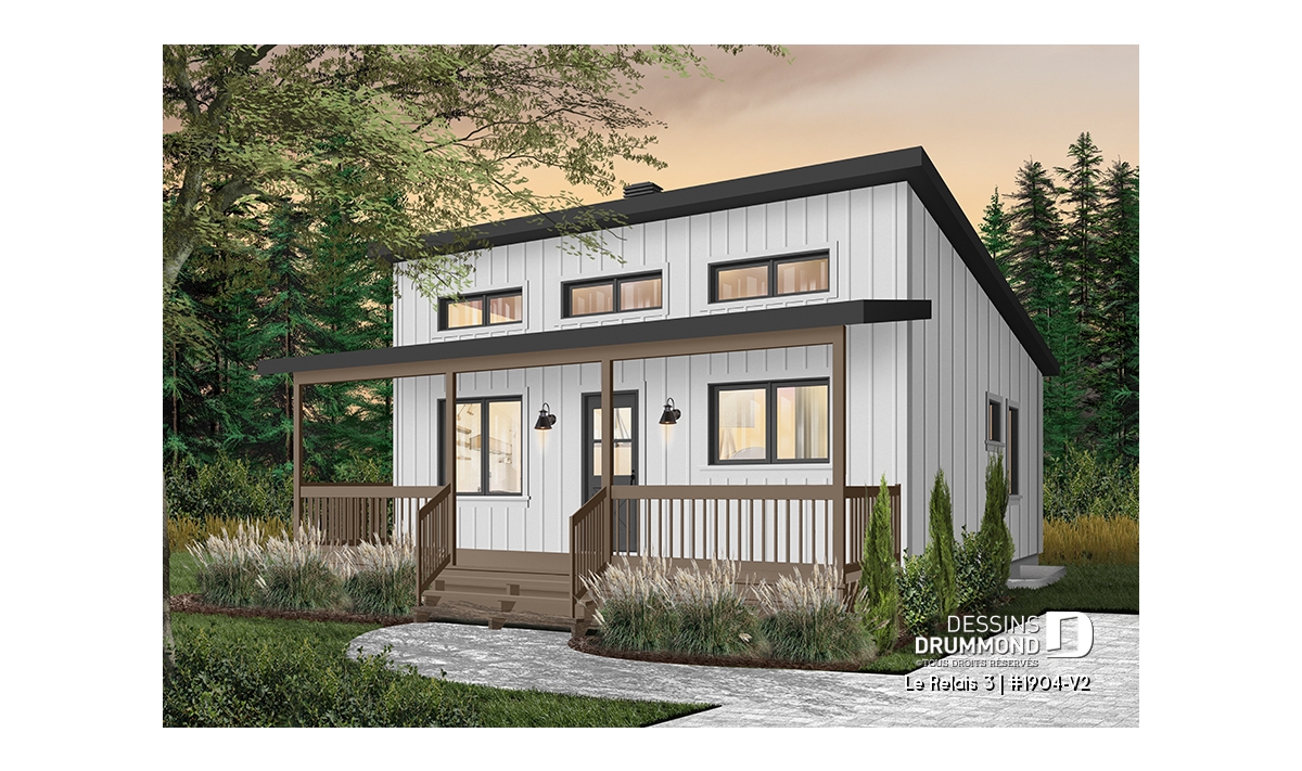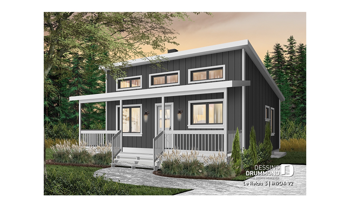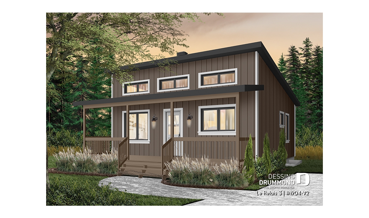 Plan de chalet moderne 4 saisons – 2 à 4 chambres, sous-sol modulable et poêle à bois