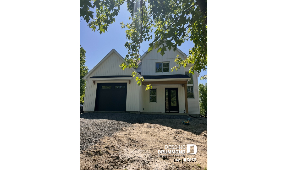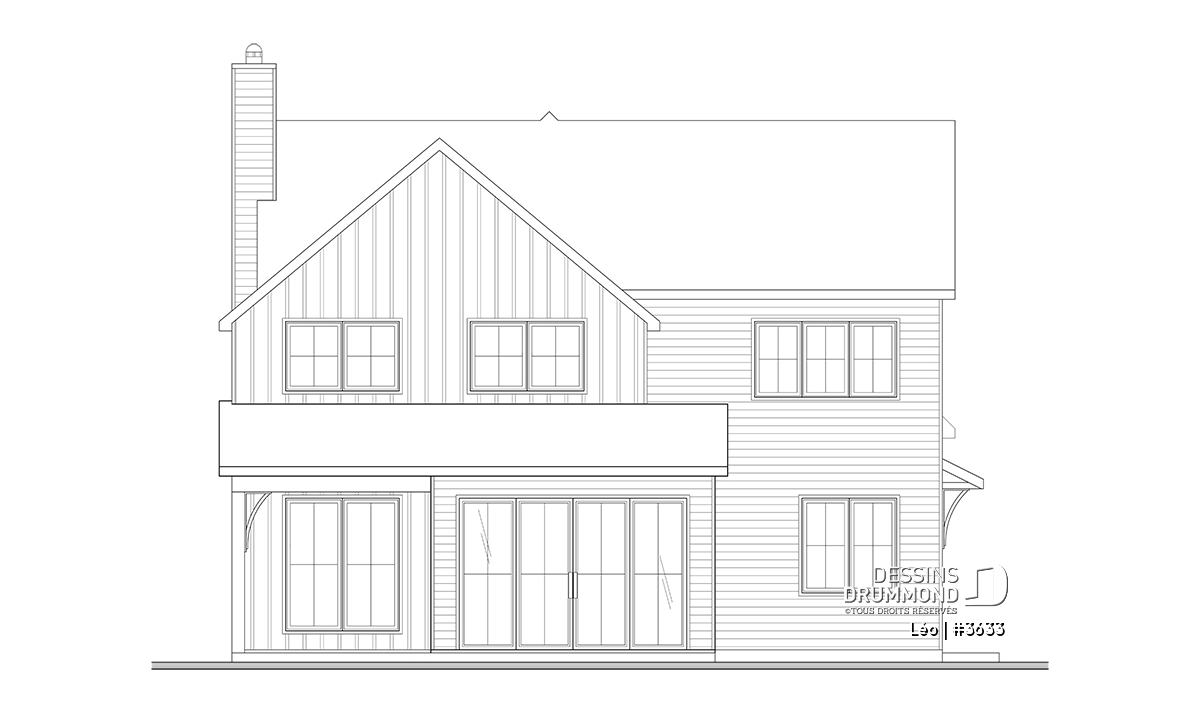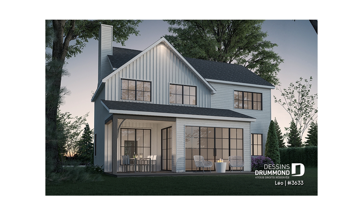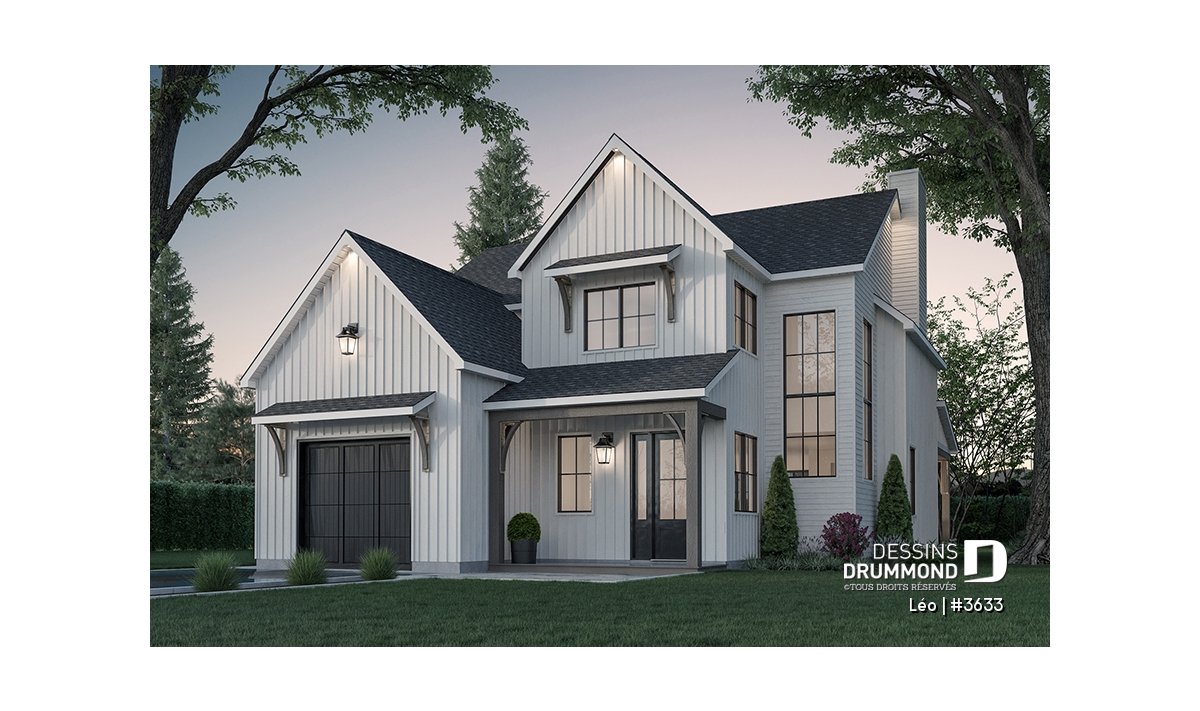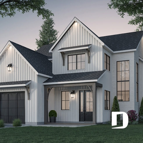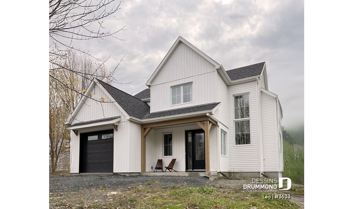 Le plan de maison farmhouse LÉO (#3633) propose 2150 pi.ca. aménagés sur 2 étages. La fondation est de type dalle flottante, mais nous offrons aussi d'autres options pour ceux qui aimeraient avoir un sous-sol régulier ou autres. Tous les plafonds du rez-de-chaussée sont à 9' de hauteur, ce qui donne une belle amplitude aux différents espaces.