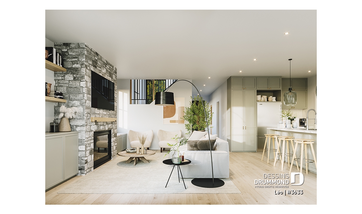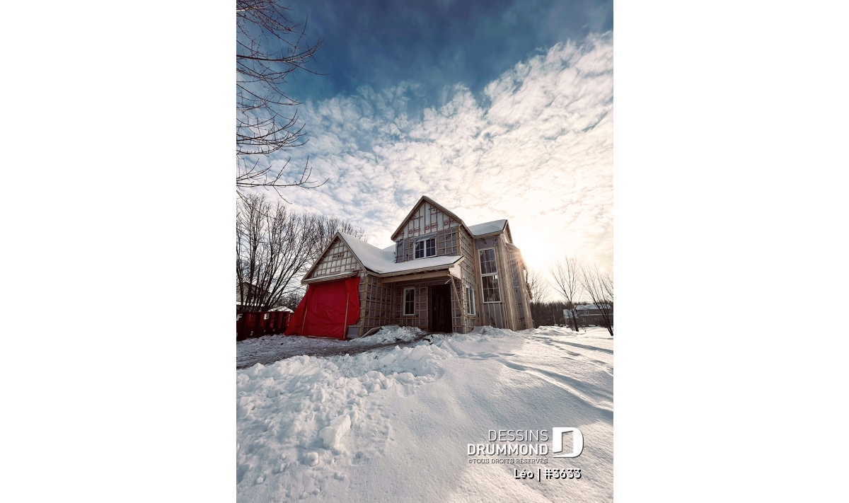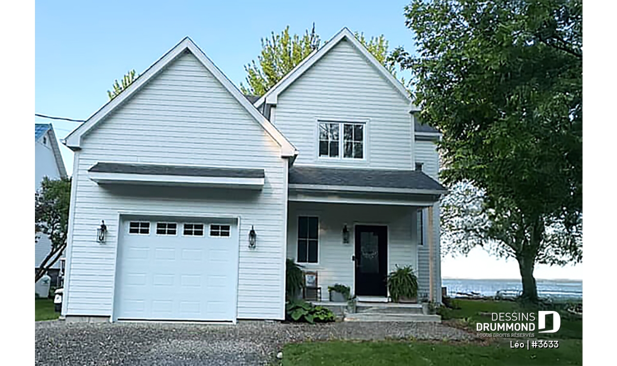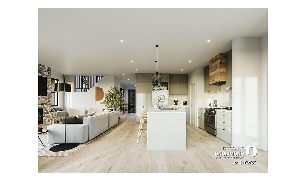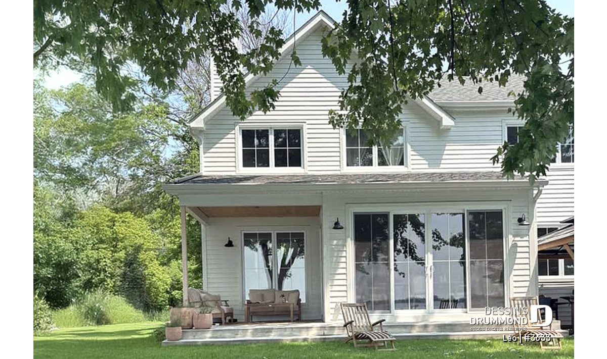 Le plan de maison farmhouse LÉO (#3633) propose 2150 pi.ca. aménagés sur 2 étages. La fondation est de type dalle flottante, mais nous offrons aussi d'autres options pour ceux qui aimeraient avoir un sous-sol régulier ou autres. Tous les plafonds du rez-de-chaussée sont à 9' de hauteur, ce qui donne une belle amplitude aux différents espaces.