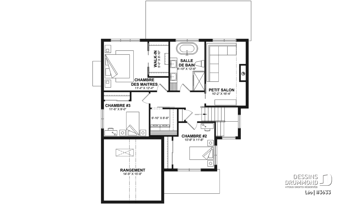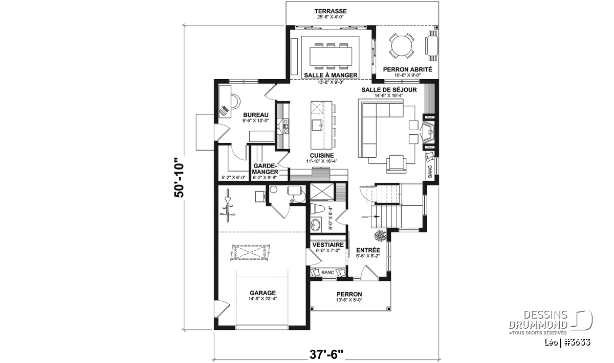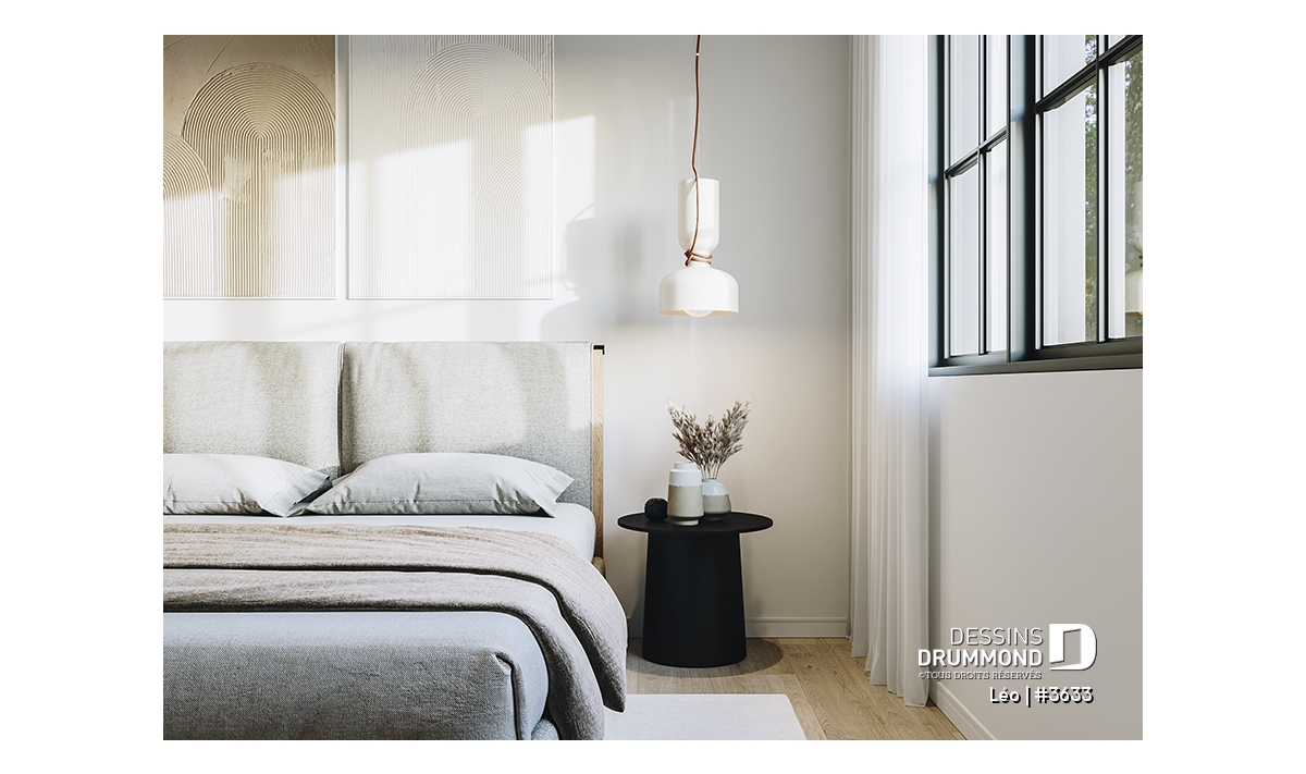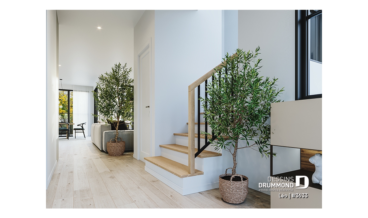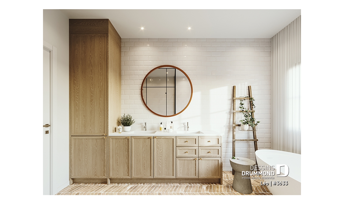 Le plan de maison farmhouse LÉO (#3633) propose 2150 pi.ca. aménagés sur 2 étages. La fondation est de type dalle flottante, mais nous offrons aussi d'autres options pour ceux qui aimeraient avoir un sous-sol régulier ou autres. Tous les plafonds du rez-de-chaussée sont à 9' de hauteur, ce qui donne une belle amplitude aux différents espaces.