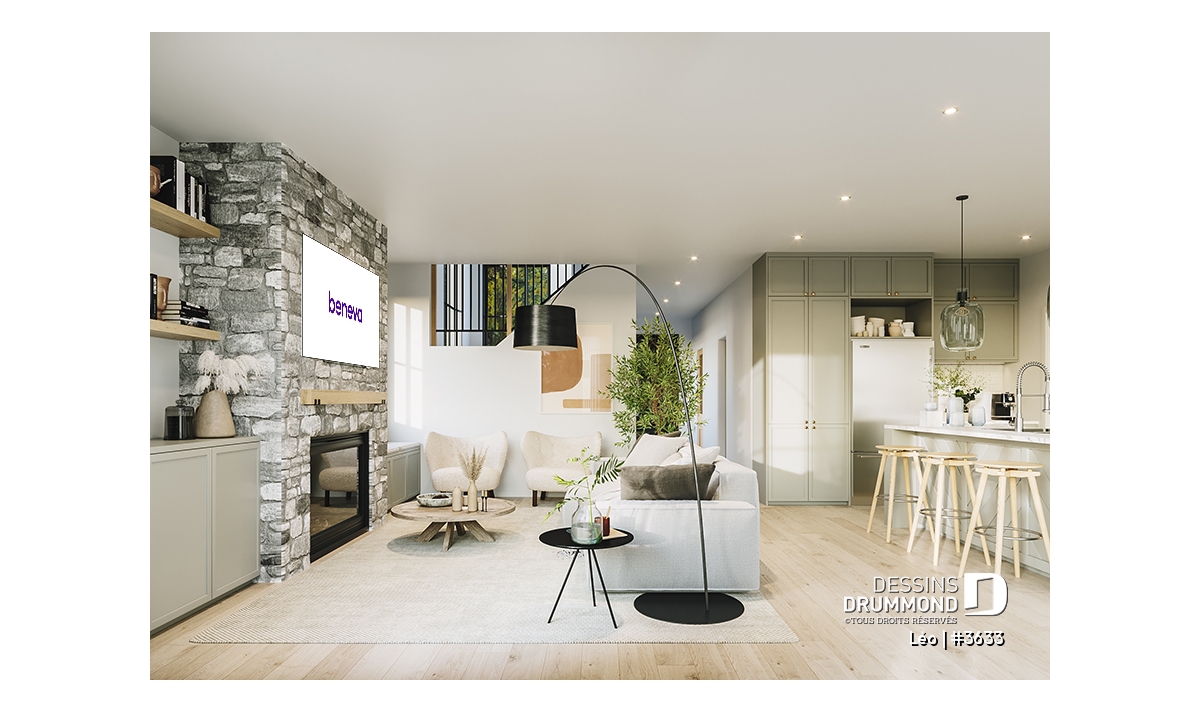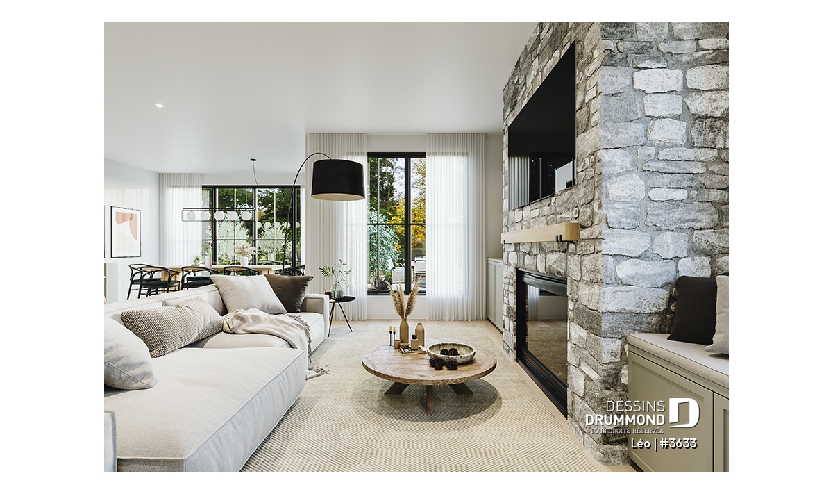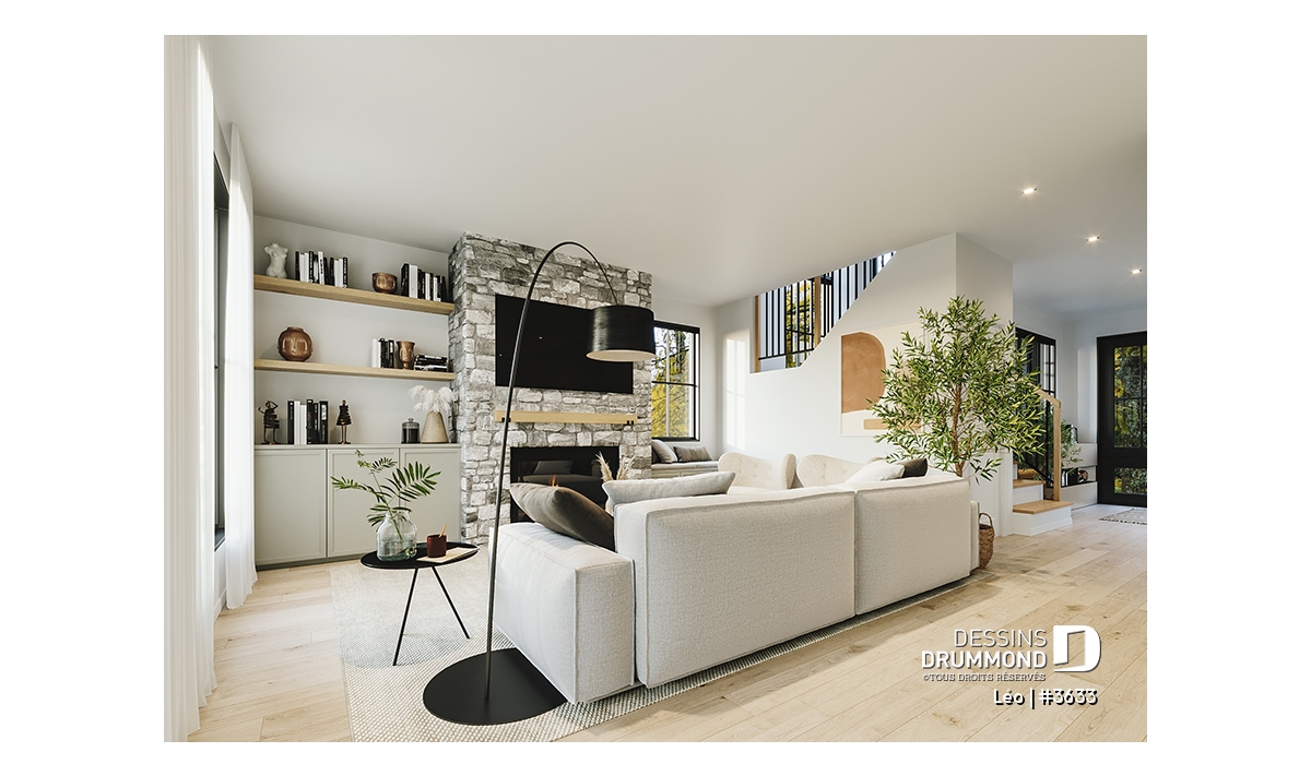 L'entrée du garage vers la maison ainsi que l'accès avant principal se partagent un grand vestiaire. Puis, immédiatement sur votre gauche, se retrouve une salle de douche qui est localisée en retrait du secteur activité, idéale pour les invités. La cuisine, salle à dîner et salon sont à aire ouverte et baignés par la lumière naturelle provenant des fenêtres et portes-patios prévus à ce secteur. Un îlot et garde-manger sont prévus à la cuisine. Le salon propose un foyer avec banquette d'un côté et meubles encastrés de l'autre. Un bureau est aussi situé en retrait de la cuisine.