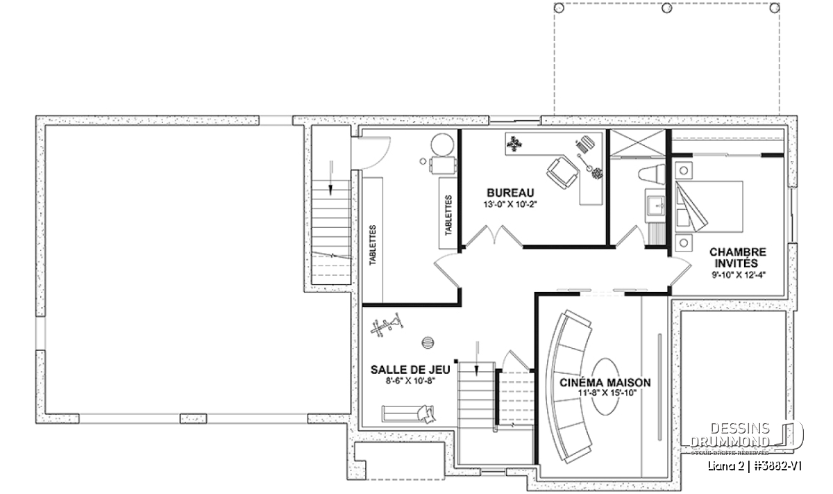 Sous-sol comportant un cinéma maison de bon format ainsi qu'une salle de jeux, une chambres d'invités, un bureau, une salle de douche et un rangement.
