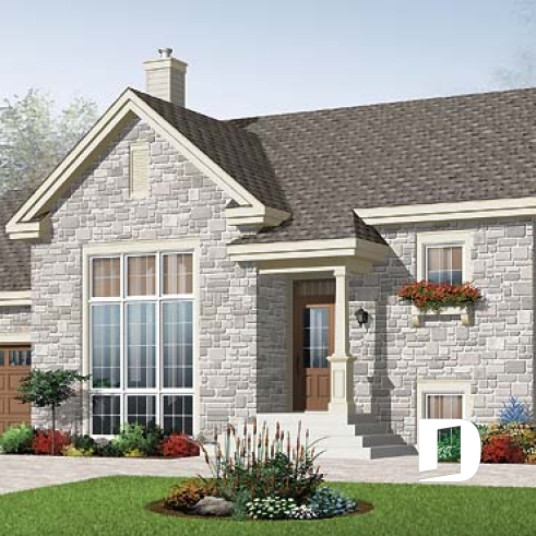L’originalité de ce modèle se traduit par la présence d’une suite des maîtres au rez-de-chaussée pour laquelle un bain et une douche en coin tout comme une vanité sont aménagés à même la chambre. On retrouve de plus, au rez-de-chaussée, une entrée principale, une salle à manger donnant sur une terrasse arrière couverte, une cuisine tout à fait adéquate et un coin toilette. Sur le palier conduisant au demi sous-sol, on remarque une entrée secondaire attenante à un espace buanderie et on est emballé par l’ampleur de la salle de séjour qui partage le demi sous-sol avec deux chambres secondaires, une salle de douche et un bel espace atelier-rangement. Ici, le concept de demi sous-sol favorise grandement l’aménagement de fenêtres de bonnes dimensions et, par le fait même, un éclairage naturel tout de même fort intéressant.