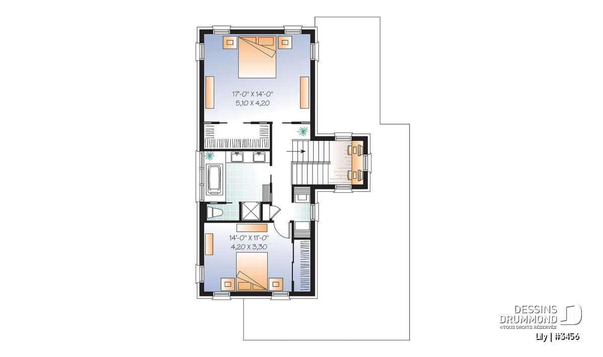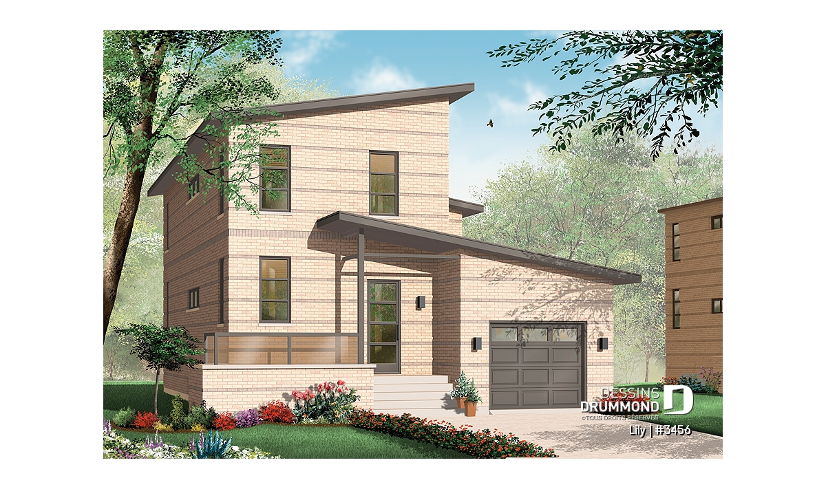 L’intérieur se veut tout aussi contemporain avec ses lignes droites et un plafond à tout près de 9 pieds au rez-de-chaussée. Ici, on est emballé par une salle de séjour remarquable avec son foyer centré auquel des banquettes ou rangements sont attenants et par une luminosité obtenue via une fenestration sur trois murs extérieurs. Autres éléments dignes de mention : cette cuisine fonctionnelle avec îlot central, des rangements plus qu’adéquats aux entrées et aux chambres, une salle de bain fort bien organisée avec toilette en cabine, un espace ordinateur prévu au palier de l’escalier et à mi-chemin entre le rez-de-chaussée et l’étage et la possibilité de construire le modèle en deux chambres ( no 3456 ) ou trois chambres ( no 3458 ) à l’étage.