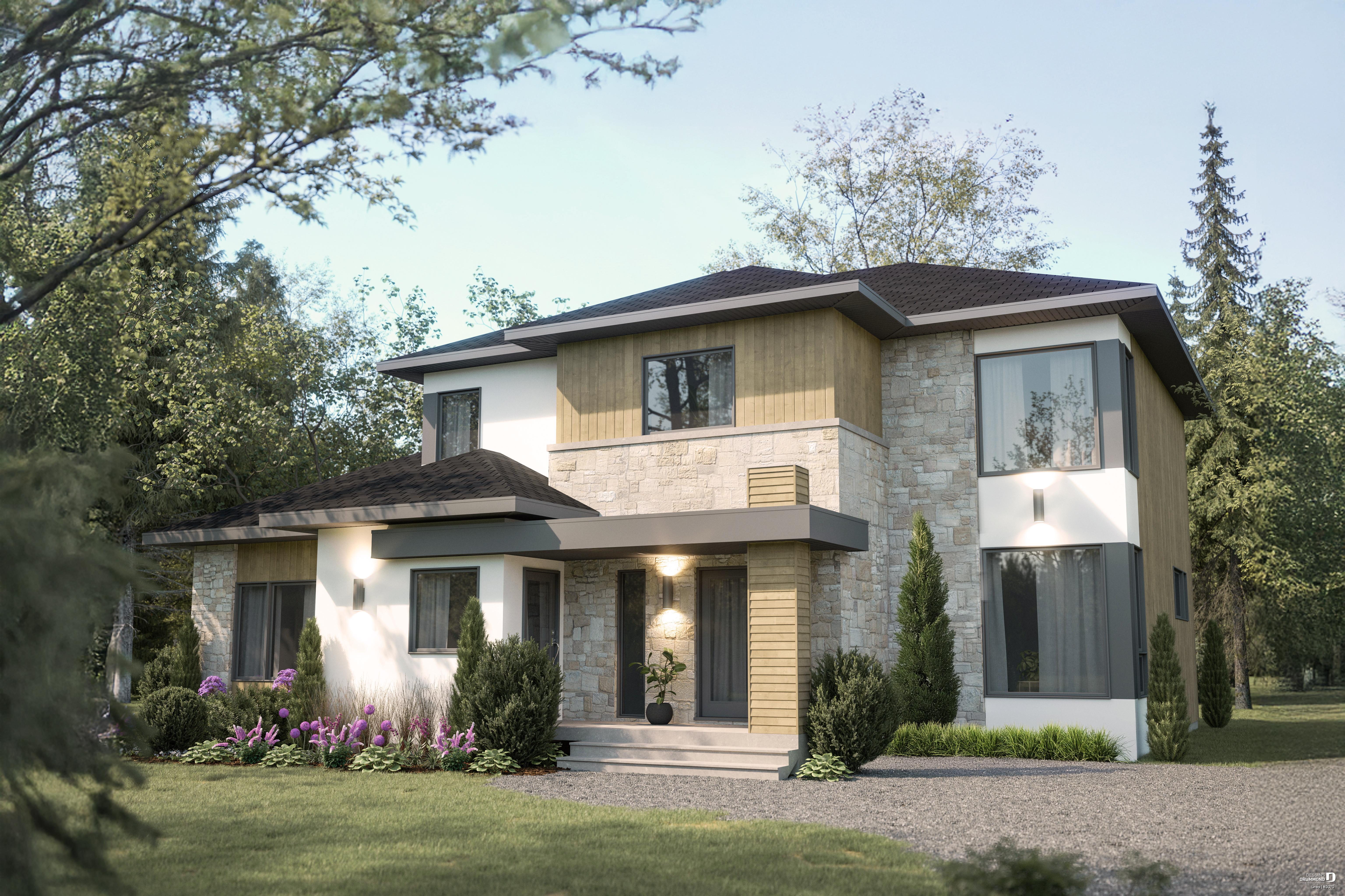 Les estimations de maison incluent les revêtements tels qu'illustrés sur notre site. Les maisons modestes sont calculées avec un revêtement de clin régulier en vinyle. Pour les maisons régulières et plus complexes, nous ajoutons des montants approximatifs (au pi.ca.) : clin de fibrociment, de cèdre, maçonnerie légère ou régulière (partiel ou total), board & batten, bois, et autres. Les poutres de bois illustrées sur l'extérieure de nos maisons sont aussi incluses dans le coût, mais elles sont «capées » et non en bois massif. Il en est de même pour les portes d'entrée et portes de garage. Elles sont incluses aux estimations, mais de qualité standard. Concernant les revêtements de maçonnerie : on propose, sur plusieurs modèles, une touche de brique-pierre comme on en retrouve chez la plupart des fabricants de brique (faire attention de ne pas confondre avec de la pierre naturelle, rarement sur nos illustrations et beaucoup plus dispendieuse). NOTE : Si vous souhaitez utiliser un revêtement de maçonnerie plutôt qu'un clin comme illustré sur le plan que vous avez choisi, svp nous contacter car vous aurez besoin de faire modifier le plan en conséquence.