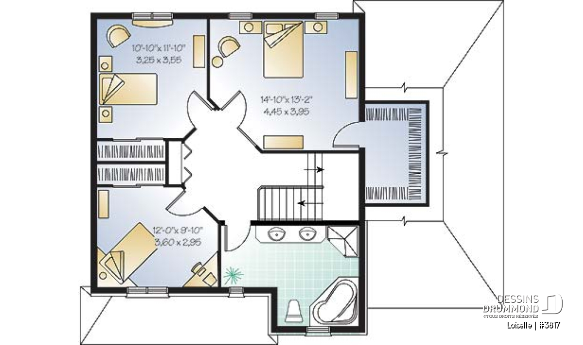 À l’étage, de belles chambres avec de bons rangements et une salle de bain à la fois confortable et originale, maximisent le plancher. On utilise ici un espace dans la toiture du garage pour assurer l’aménagement d’une grande garde-robe de type « walk-in » à la chambre des maîtres.
