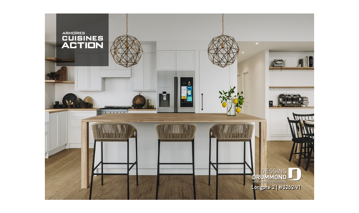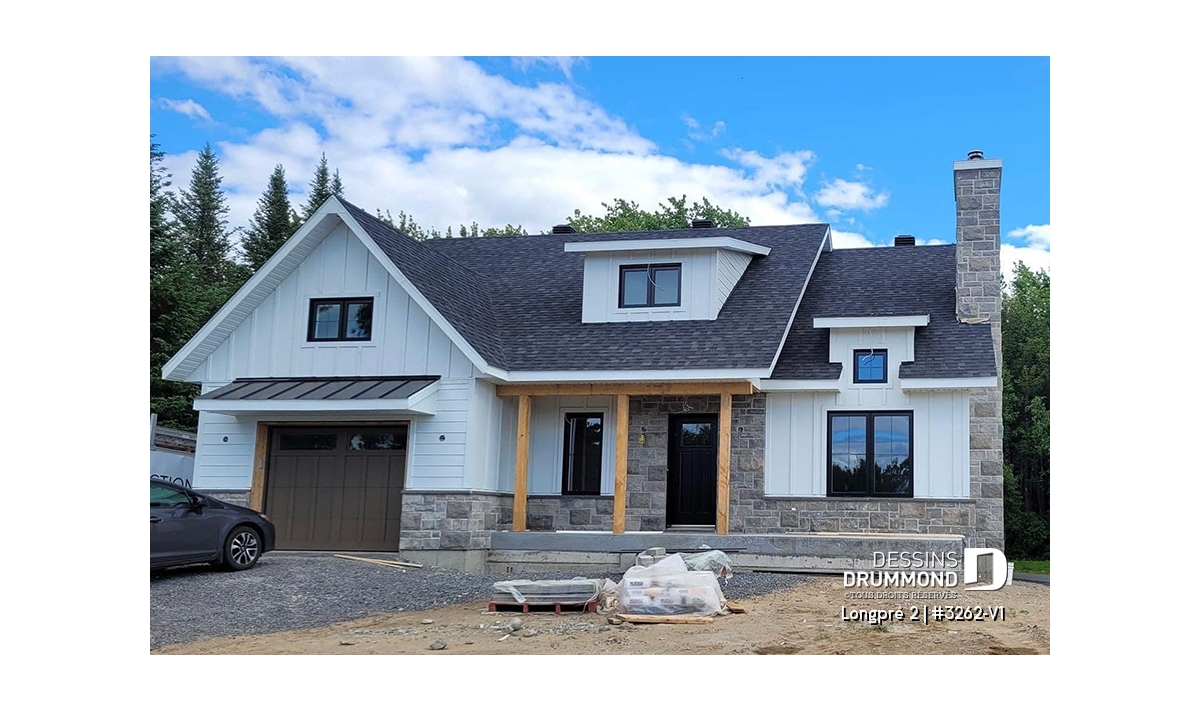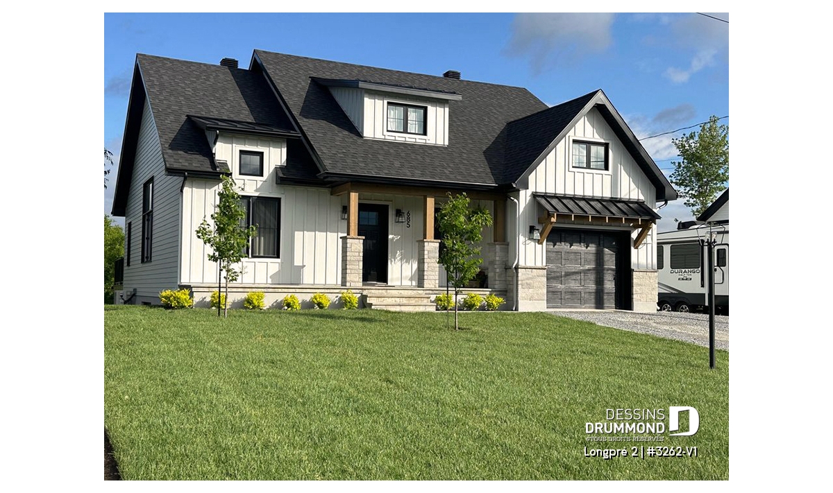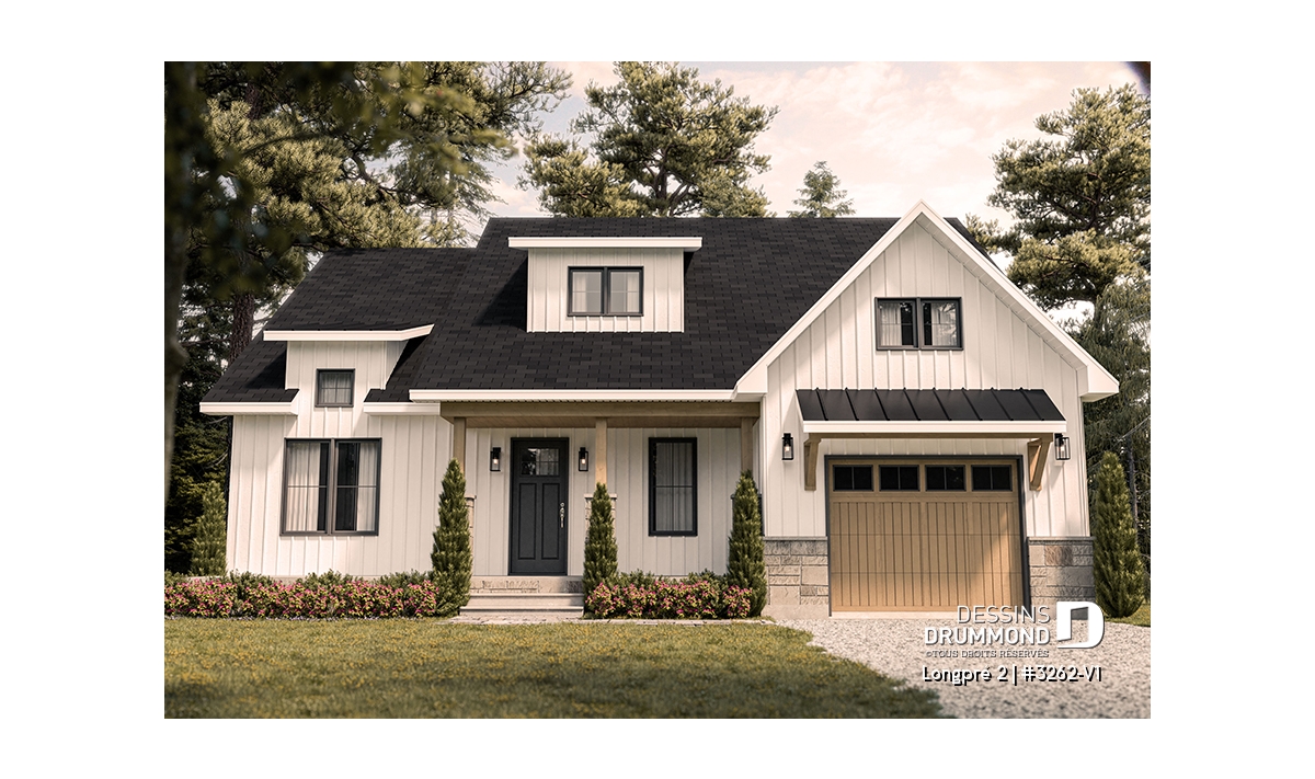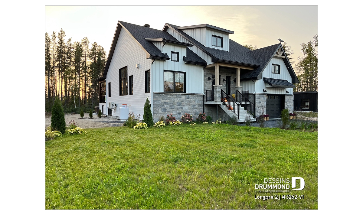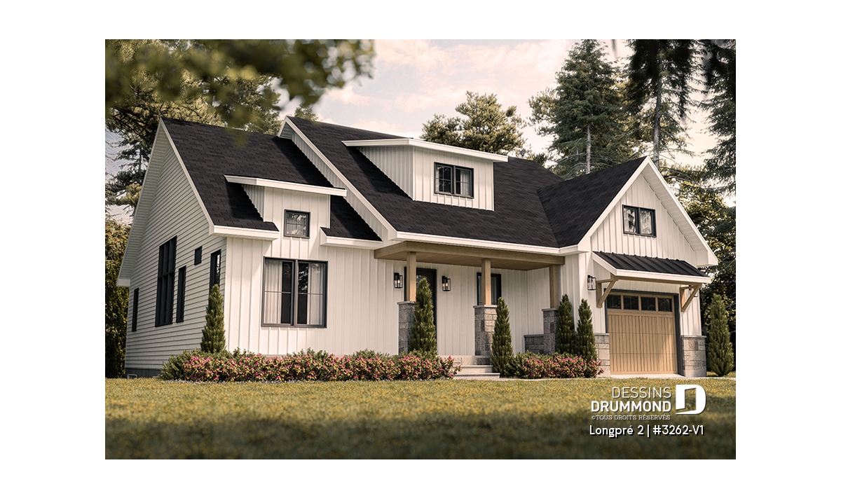 Le superbe plain-pied de style Farmhouse LONGPRÉ 2 (3262-V1) séduit au premier regard avec son garage intégré et son vaste perron avant abrité, parfait pour accueillir vos invités ou profiter des saisons québécoises à l’abri. L’entrée par le garage se distingue par un vestiaire pratique avec banquette intégrée, pensé pour faciliter la vie de famille au quotidien et garder la maison bien organisée.