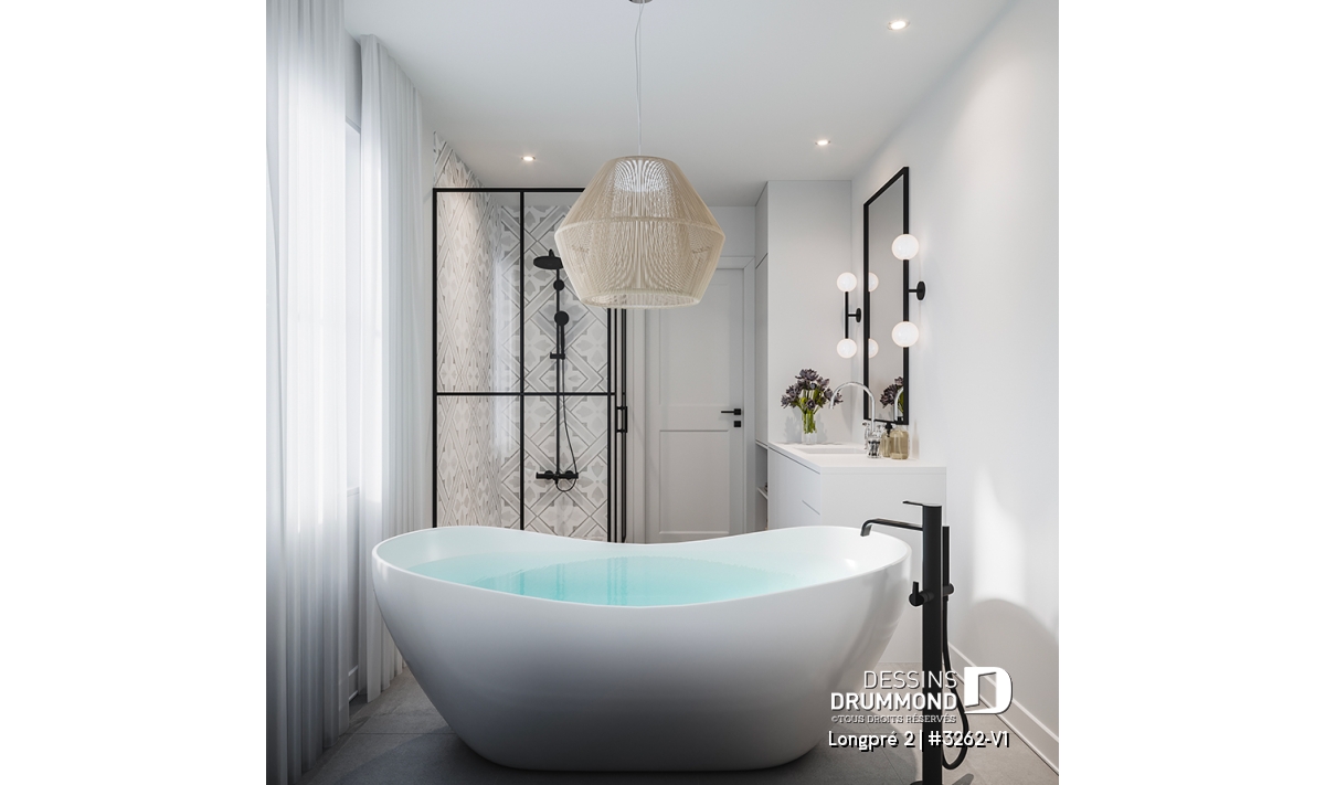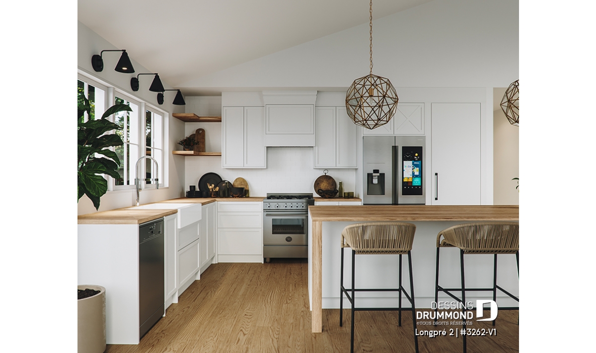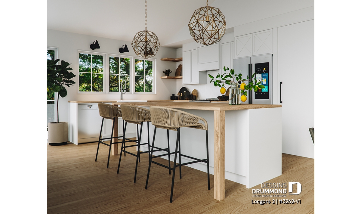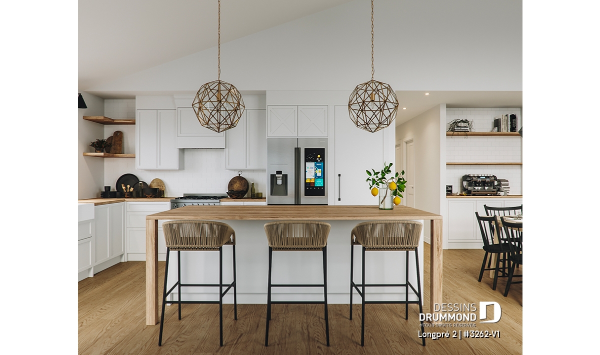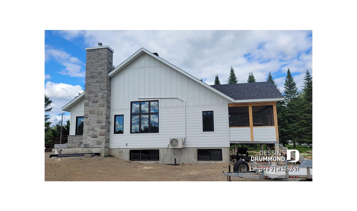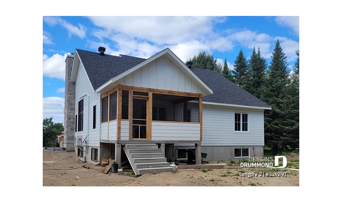 Le superbe plain-pied de style Farmhouse LONGPRÉ 2 (3262-V1) séduit au premier regard avec son garage intégré et son vaste perron avant abrité, parfait pour accueillir vos invités ou profiter des saisons québécoises à l’abri. L’entrée par le garage se distingue par un vestiaire pratique avec banquette intégrée, pensé pour faciliter la vie de famille au quotidien et garder la maison bien organisée.