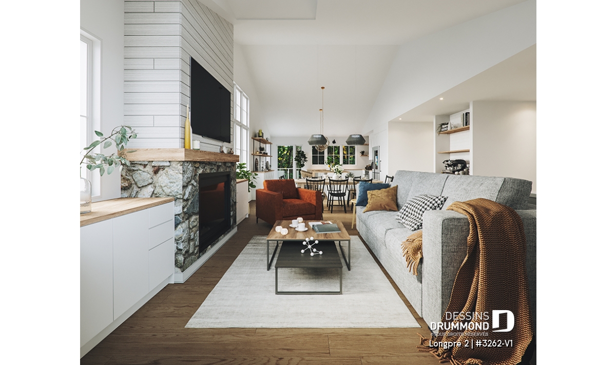 ire ouverte avec plafond cathédrale au secteur cuisine, salle à manger et salon.