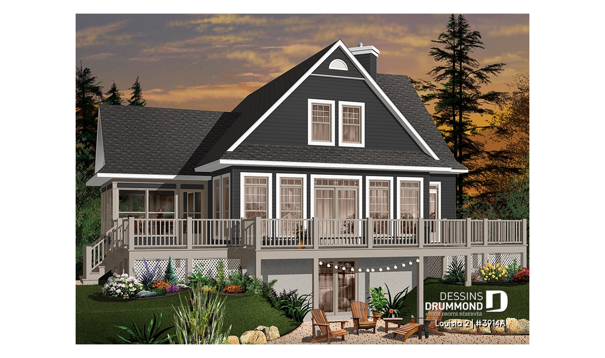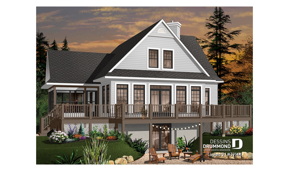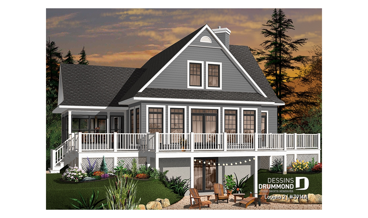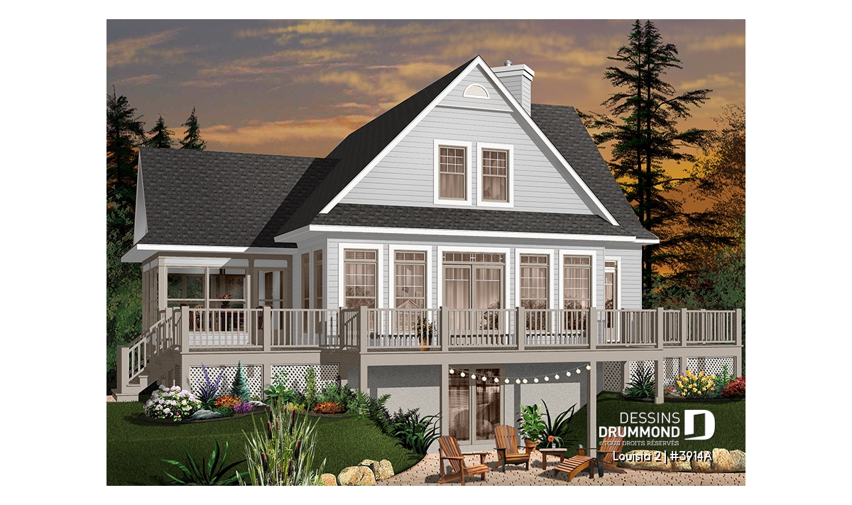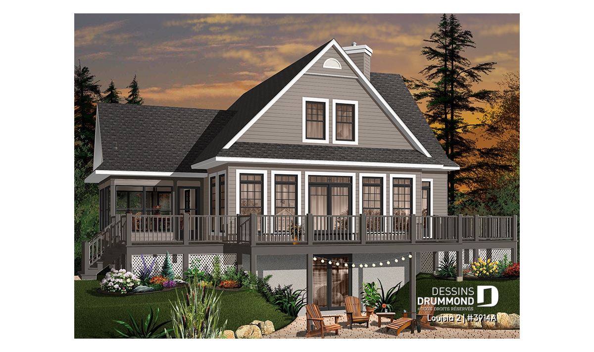 Des lignes à la fois simples et distinctives, une façade avant tout aussi attrayante que la façade arrière, une fenestration abondante, une véranda avec moustiquaire et une très grande terrasse sont les particularités extérieures de ce modèle.