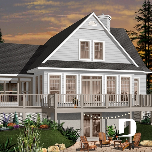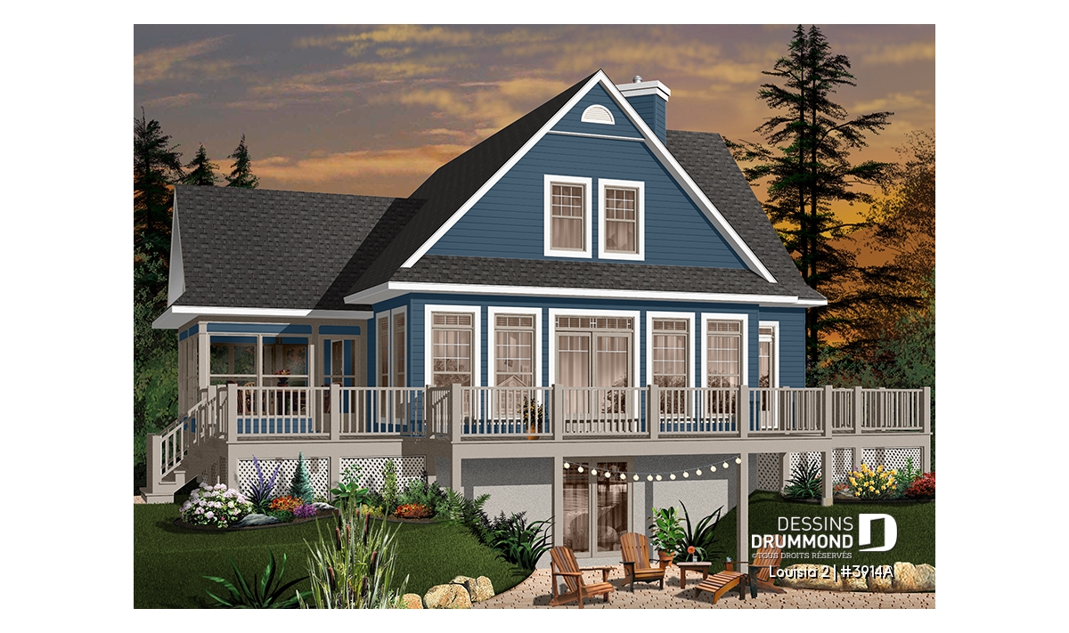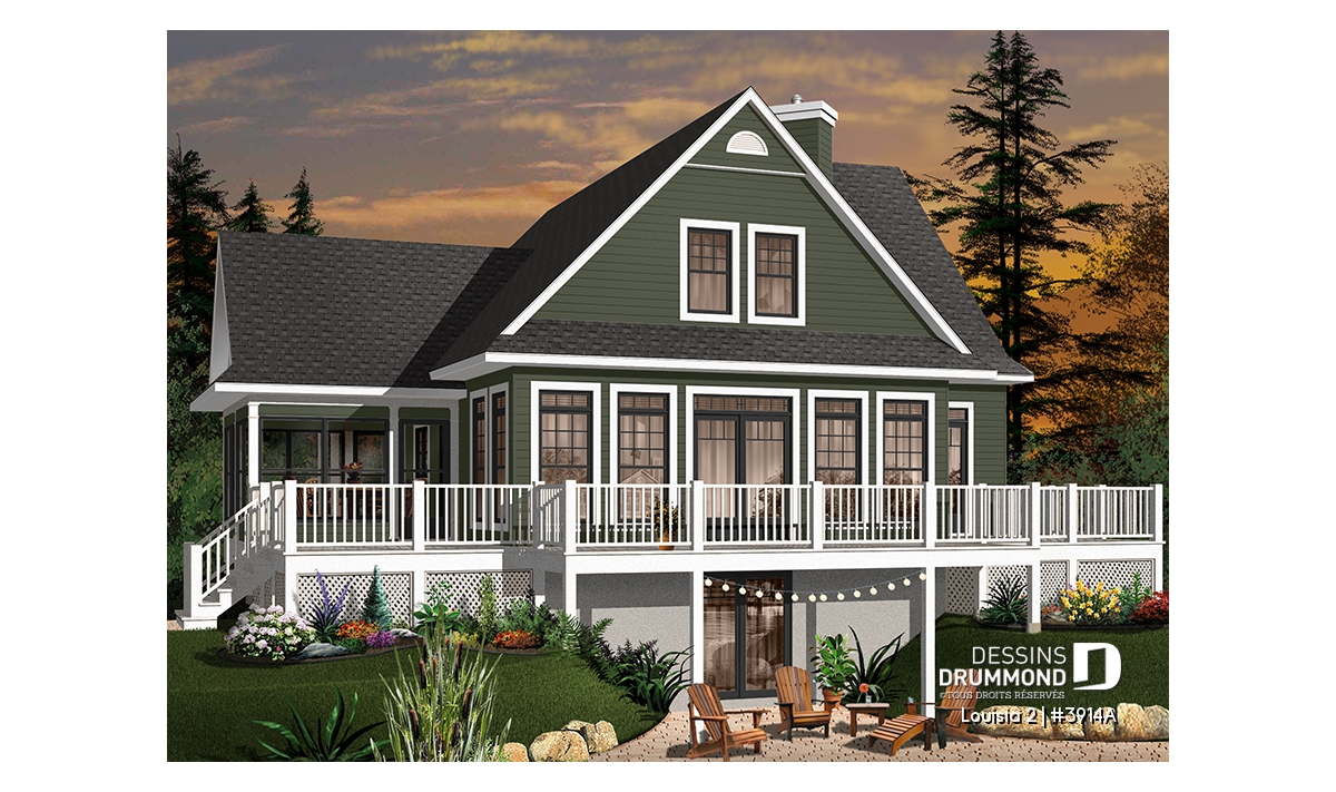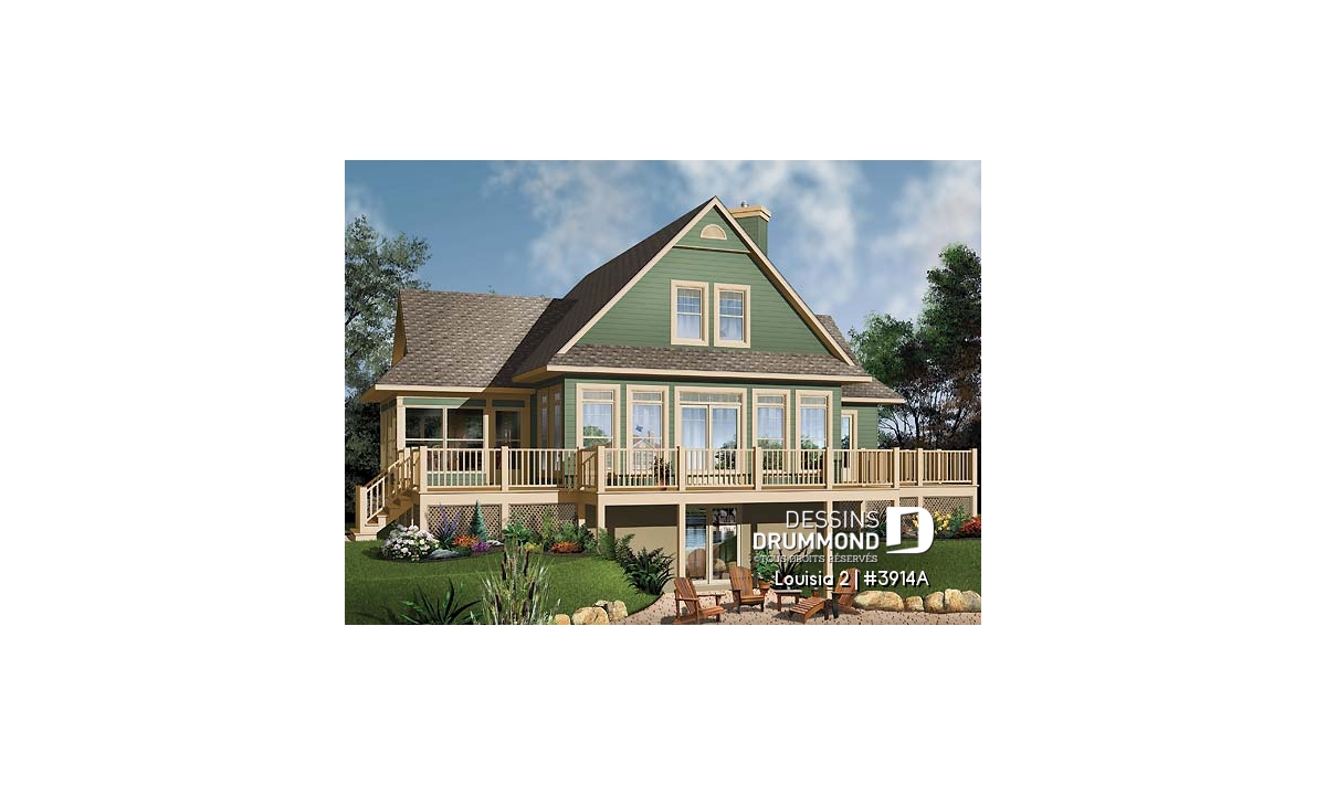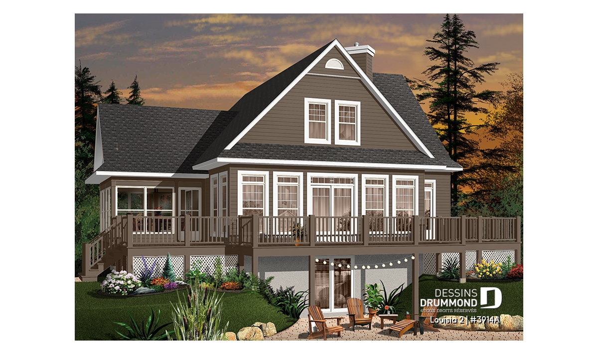 Des lignes à la fois simples et distinctives, une façade avant tout aussi attrayante que la façade arrière, une fenestration abondante, une véranda avec moustiquaire et une très grande terrasse sont les particularités extérieures de ce modèle.