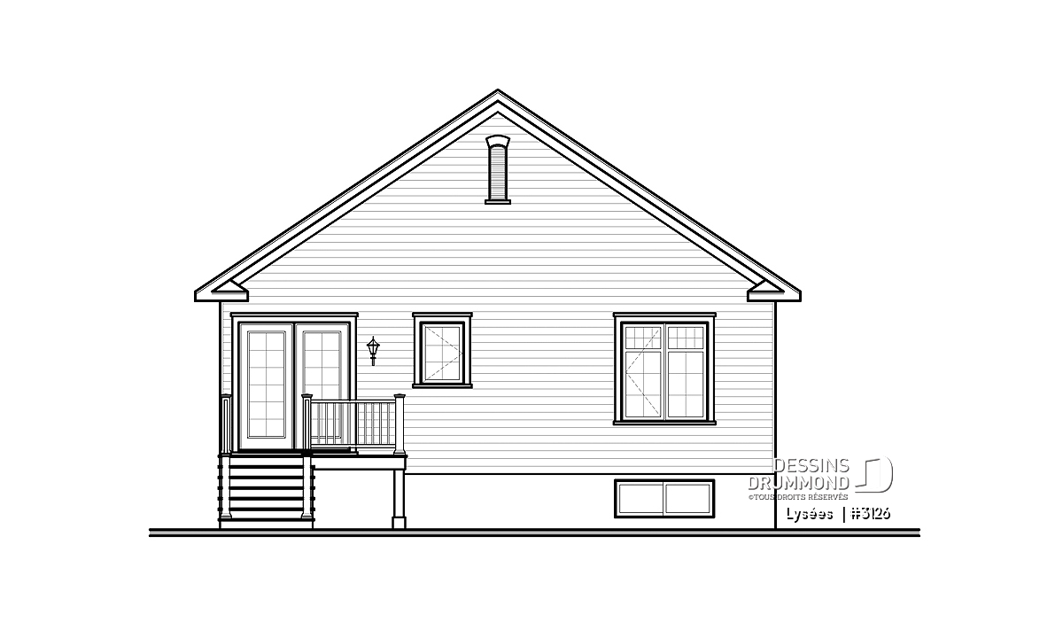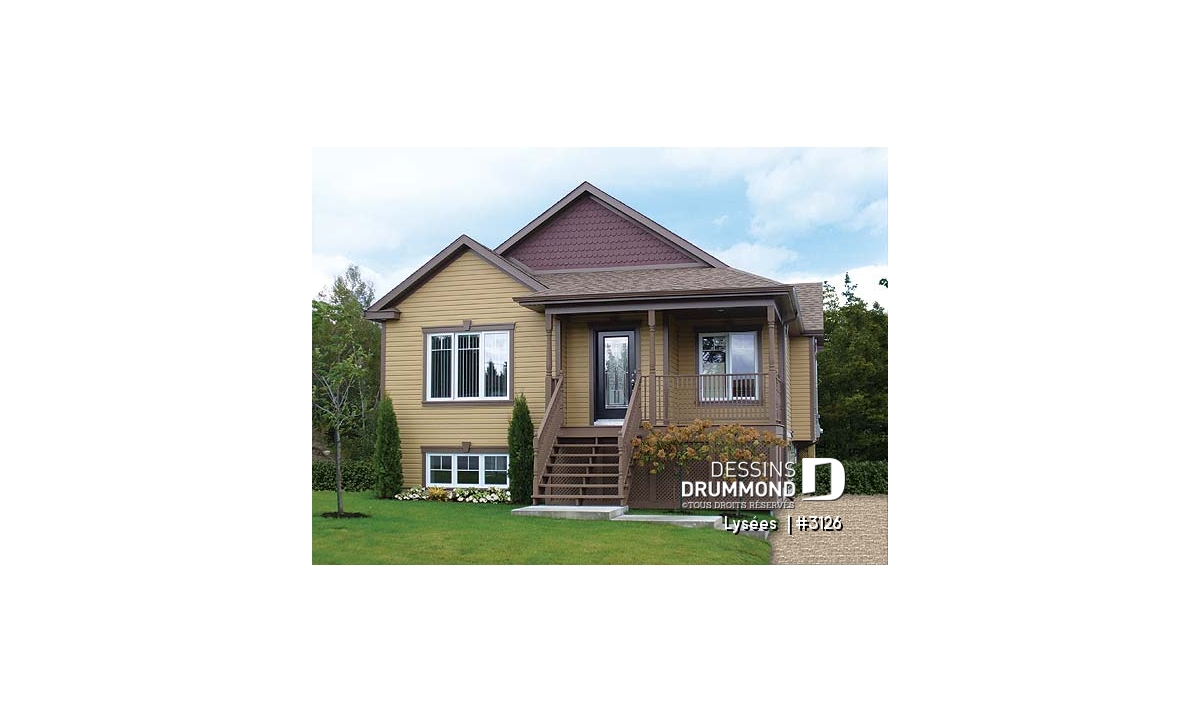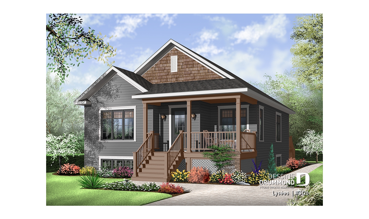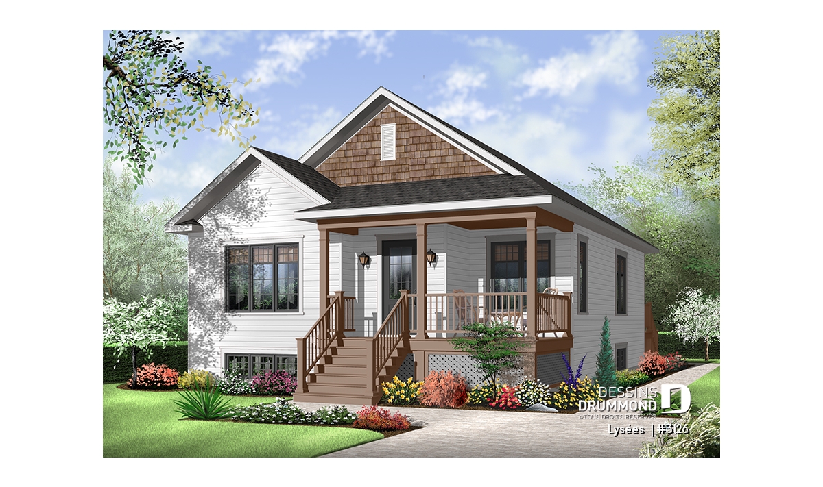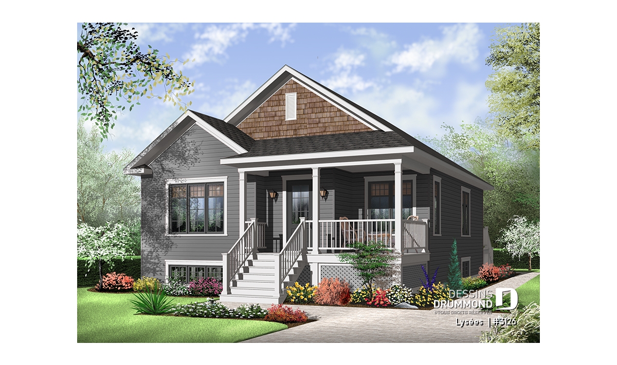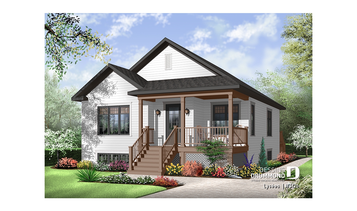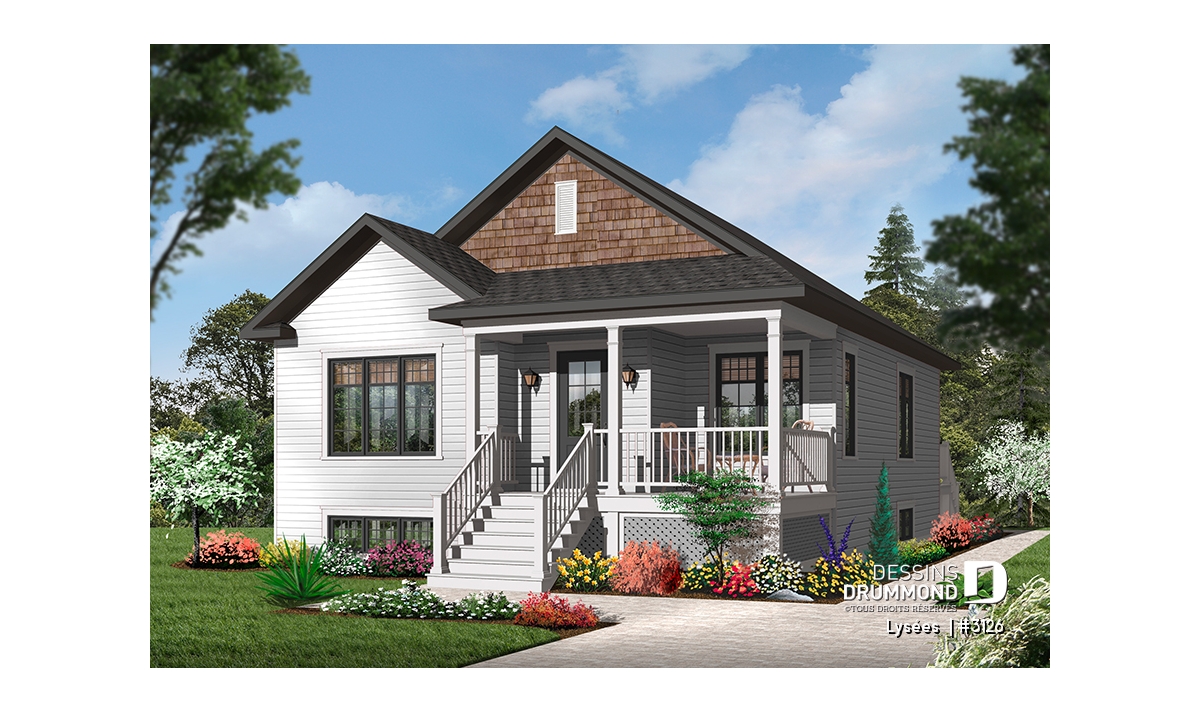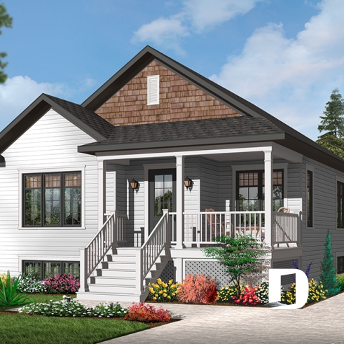 Dans la foulée de ces maisons de construction à prix de revient peu élevé, Dessins Drummond vous suggère ce modèle plutôt en profondeur auquel le pignon en façade principale confère indéniablement un certain impact visuel. Sans oublier cette fort belle galerie en « L » dont le charme est tout à fait remarquable.