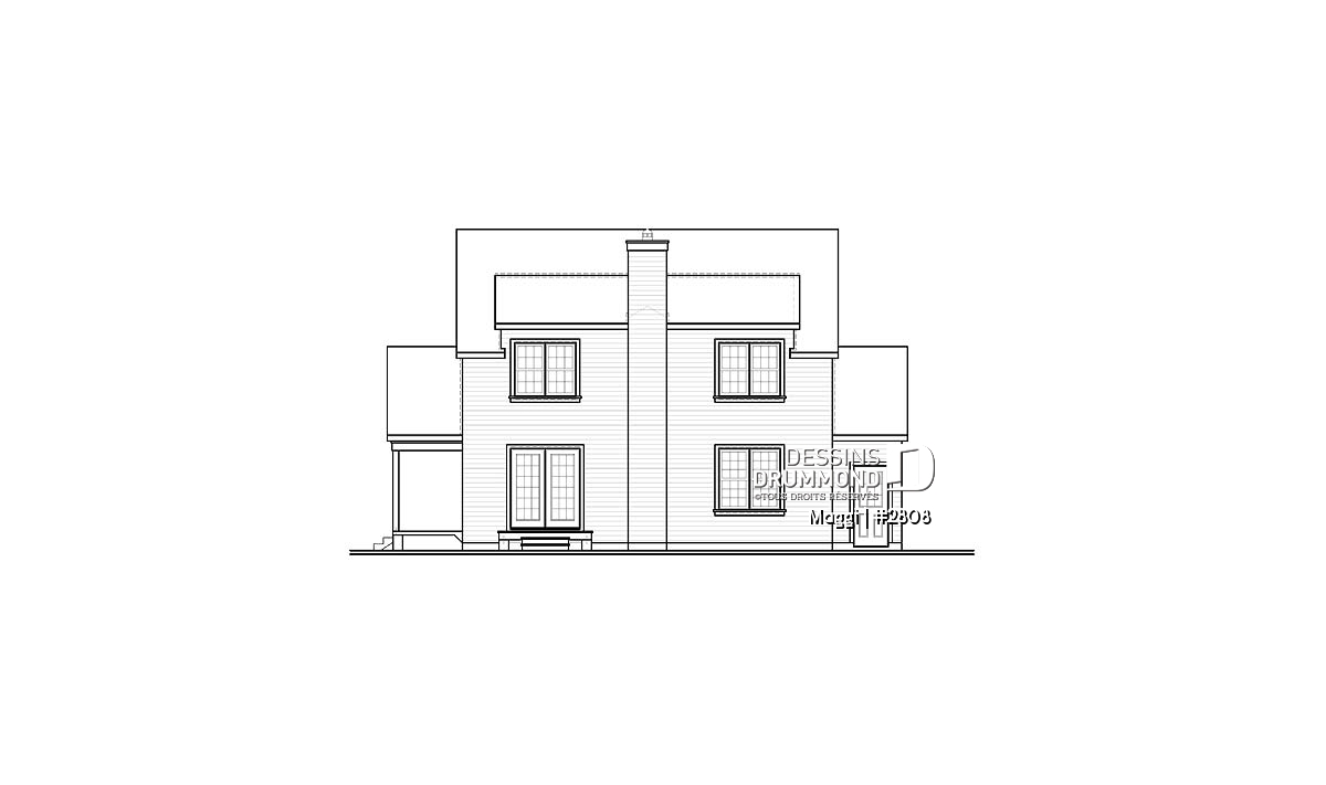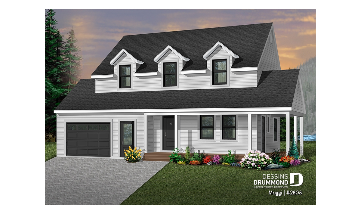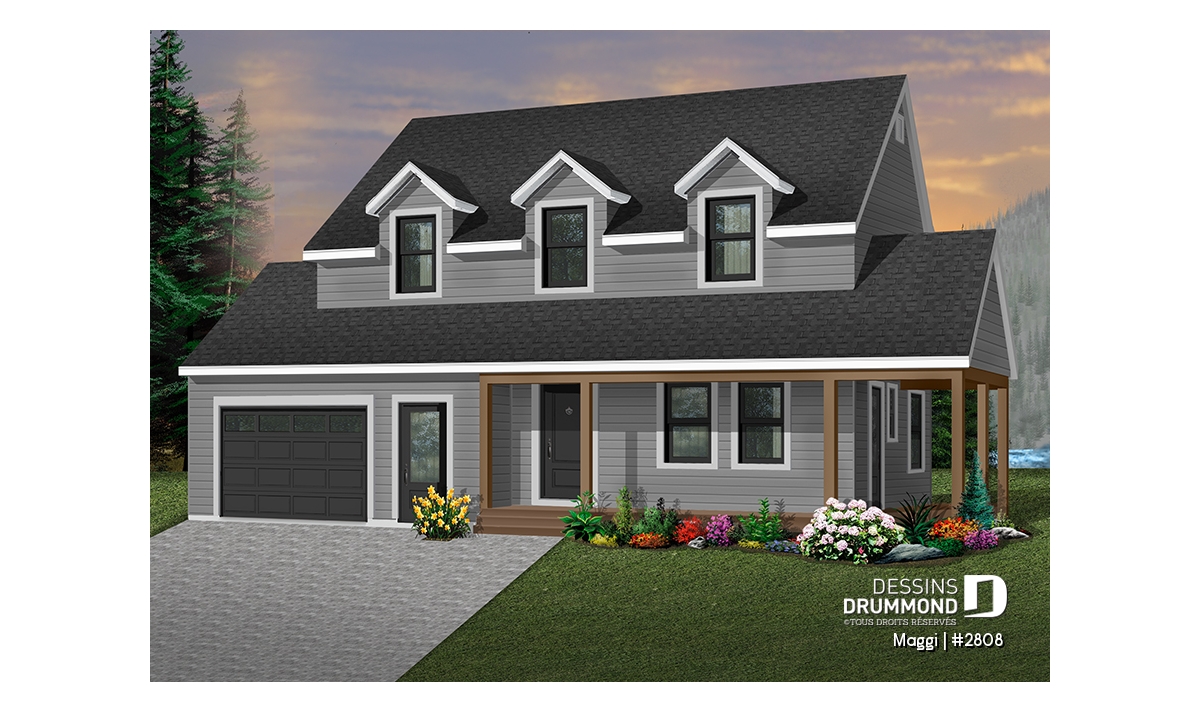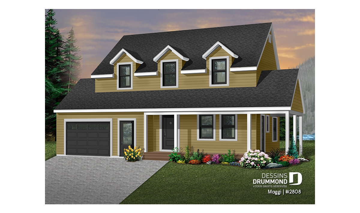 Vue avant - MODÈLE DE BASE - Plan de maison champêtre 3 chambres, garage, grande suite des maîtres, grand balcon couvert - Maggi