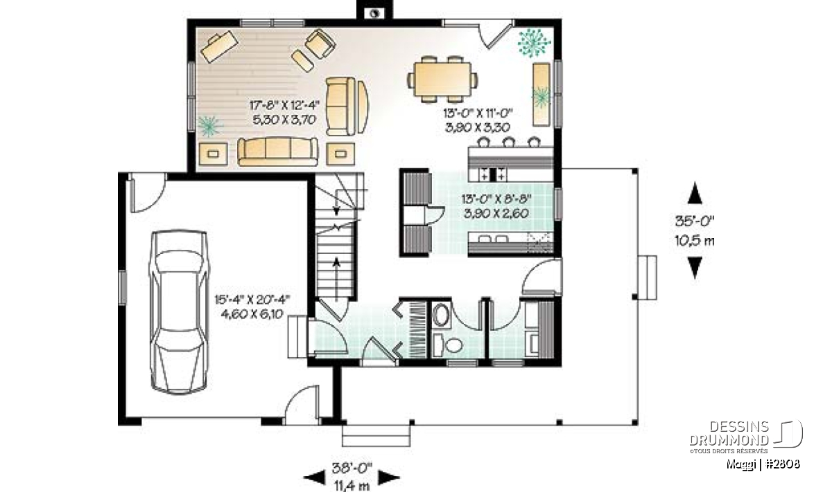 Plan de maison champêtre avec garage, 3 chambres et grand salon